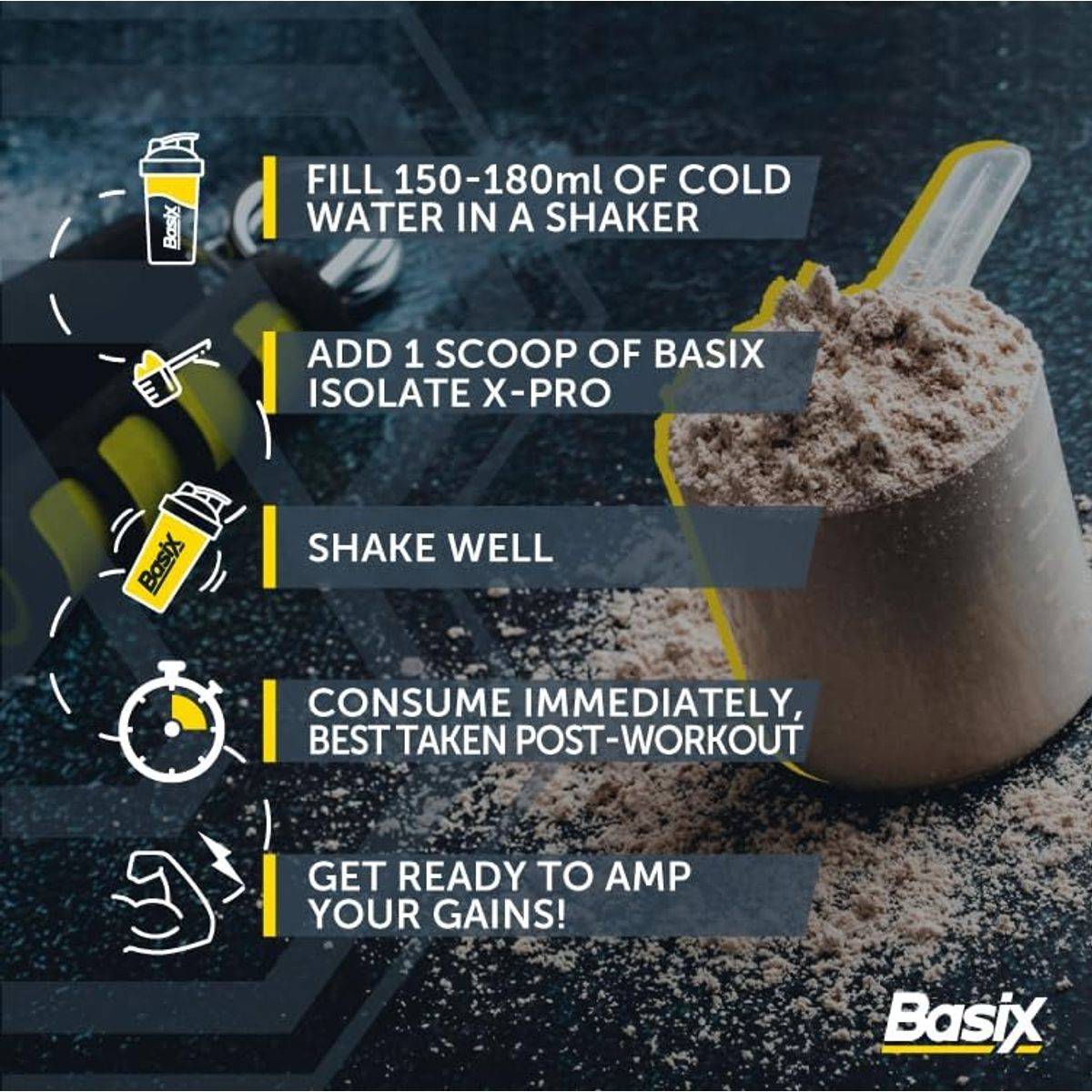 Fill 150-180ml of cold water in a shaker. Add 1 scoop of Basix Isolate X-PRO. Shake well and consume immediately, best taken post-workout.
