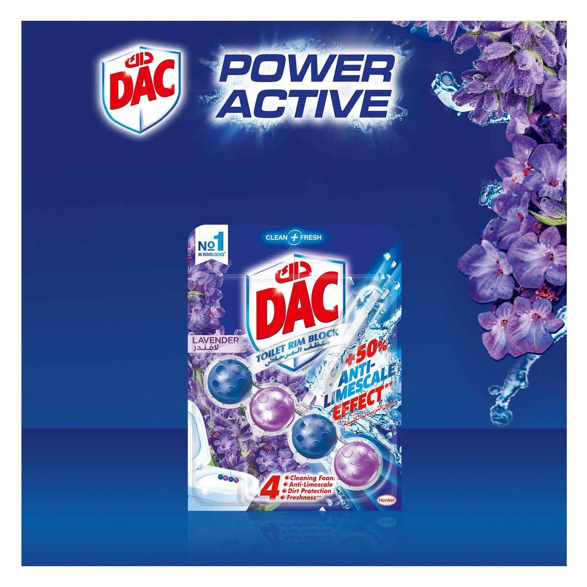 Dac Toilet Rim Block Lavender 50g keeps your toilet fresh and clean with its 4-function formula: cleaning foam, anti-limescale, dirt protection, and extra freshness. Easy to use, just hang it under the toilet rim for continuous freshness.