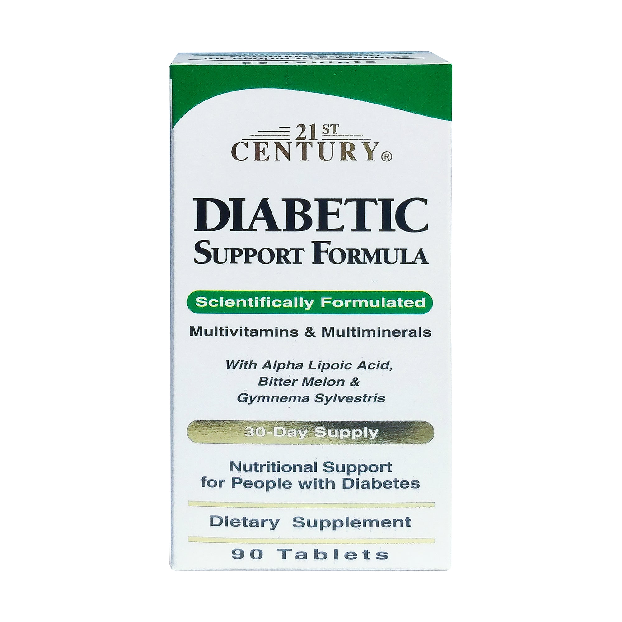 21st Century's Diabetic Support Formula provides a dynamic combination of vitamins and minerals that could be low due to the stress that diabetics can have on a body. It includes the key anti-oxidant nutrients, Vitamin A, Vitamin C, Vitamin E, and Selenium, as well as, Alpha Lipoic Acid which, along with its anti-oxidant benefits, may help maintain healthy glucose metabolism. Folic Acid is added as support for normal heart health and Chromium Picolinate to aid in the normal metabolism of protein and fat. With added herbal support from Bitter Melon and Gymnema Sylvestris, 21st Century's Diabetic Support Formula is specifically designed as nutritional support for people with diabetes.
