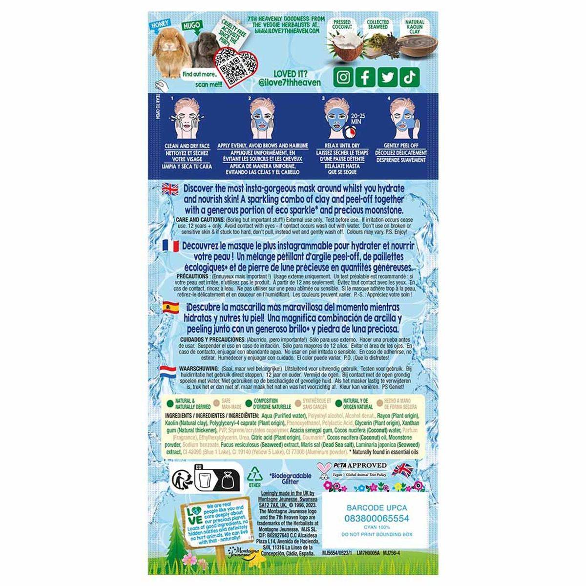 The 7th Heaven Heavenly Hydrating Aquamarine Peel Off Mask is a sparkling peel-off face mask that hydrates and nourishes the skin. Enriched with natural kaolin clay, coconut, and seaweed, it reinforces the skin's natural barrier and promotes a luminous, dewy complexion. Ideal for all skin types, it offers a fun, glittery experience while deeply cleansing and purifying pores.
