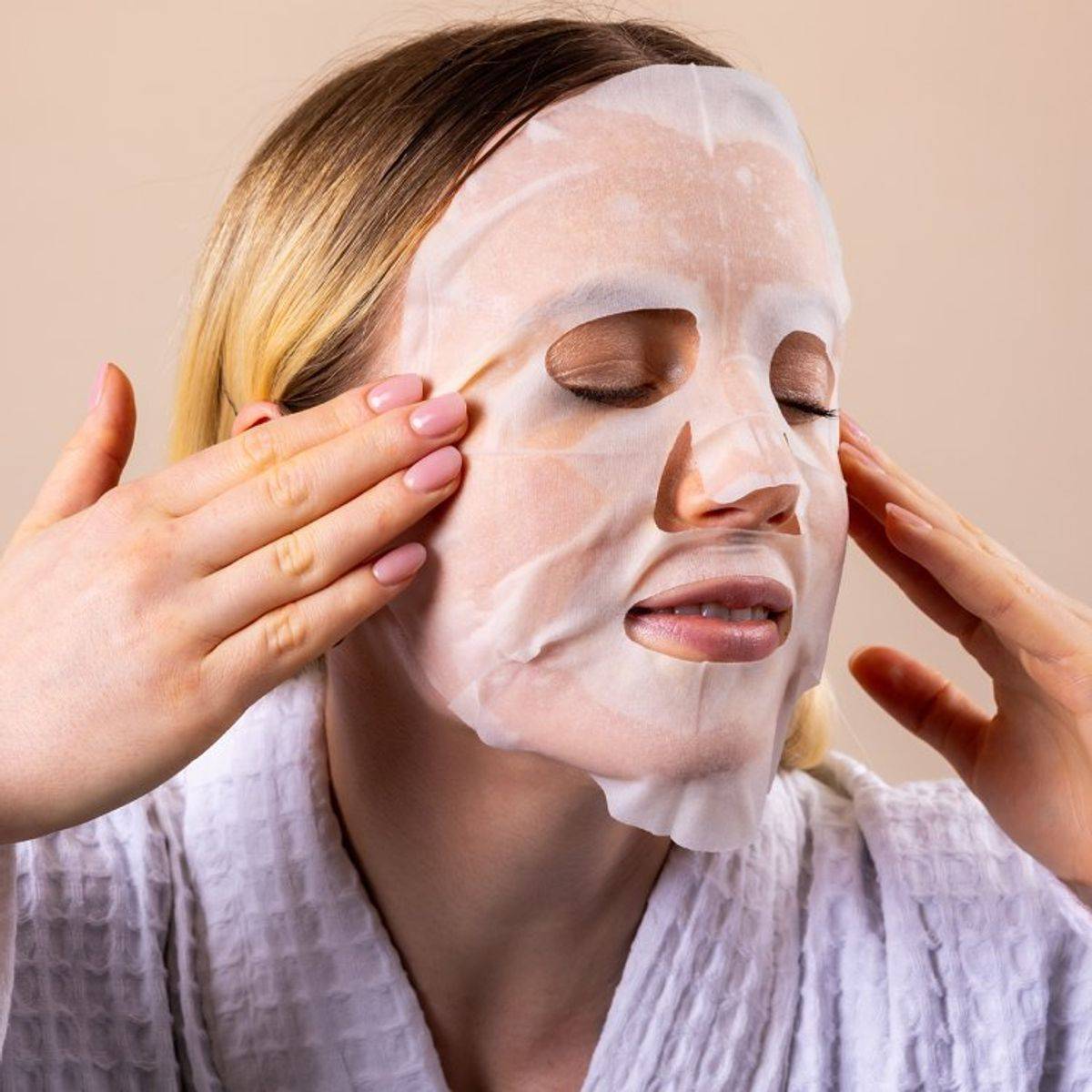 Unfold the mask and place it on your face, aligning the holes with your eyes, nose, and mouth. Leave on for 7-10 minutes. Remove the mask and gently massage the remaining product into your face and neck.