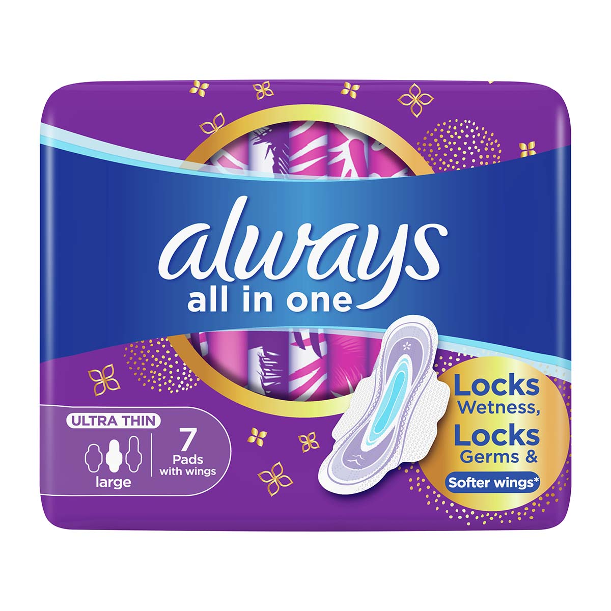 When it comes to protection, why compromise? Always All in One sanitary pad means now you wont have to. Enjoy maximum dry protection with a topsheet that locks moisture away from skin and keeps you protected from germs. Softer wings safe guard you from leakage or irritation so you can move freely. Wear Always All in One sanitary pads for all-day unbeatable protection & live fearlessly!