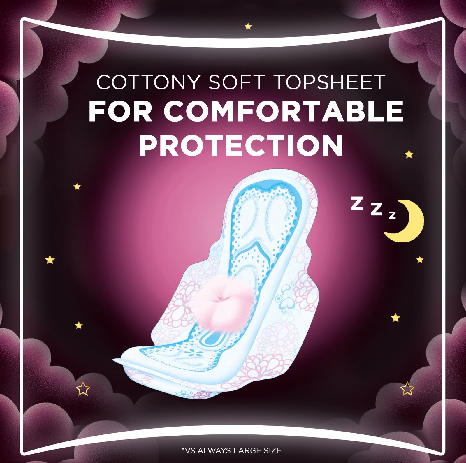 Always Breathable Soft Maxi Thick Night sanitary pads offers you true softness, down to 0% stuffiness that will last throughout the night. Try it yourself, it has changed the mind of 93% of women who tried it. This pad is longer at the back for an all night protection and is the first to be both soft (on center and wings) and breathable so you can give your skin the care and love it deserves. Always Breathable Soft Maxi Thick Night pads are rated as being softer to your skin than any other cottony brands for a comfortable protection overnight.