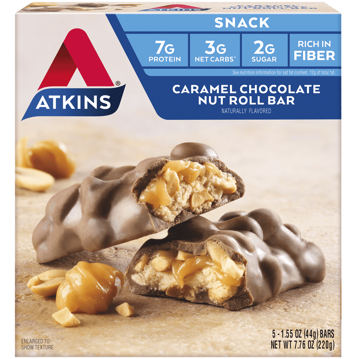 - Atkins Snack Protein Bar Caramel Chocolate Nut Roll 44g
