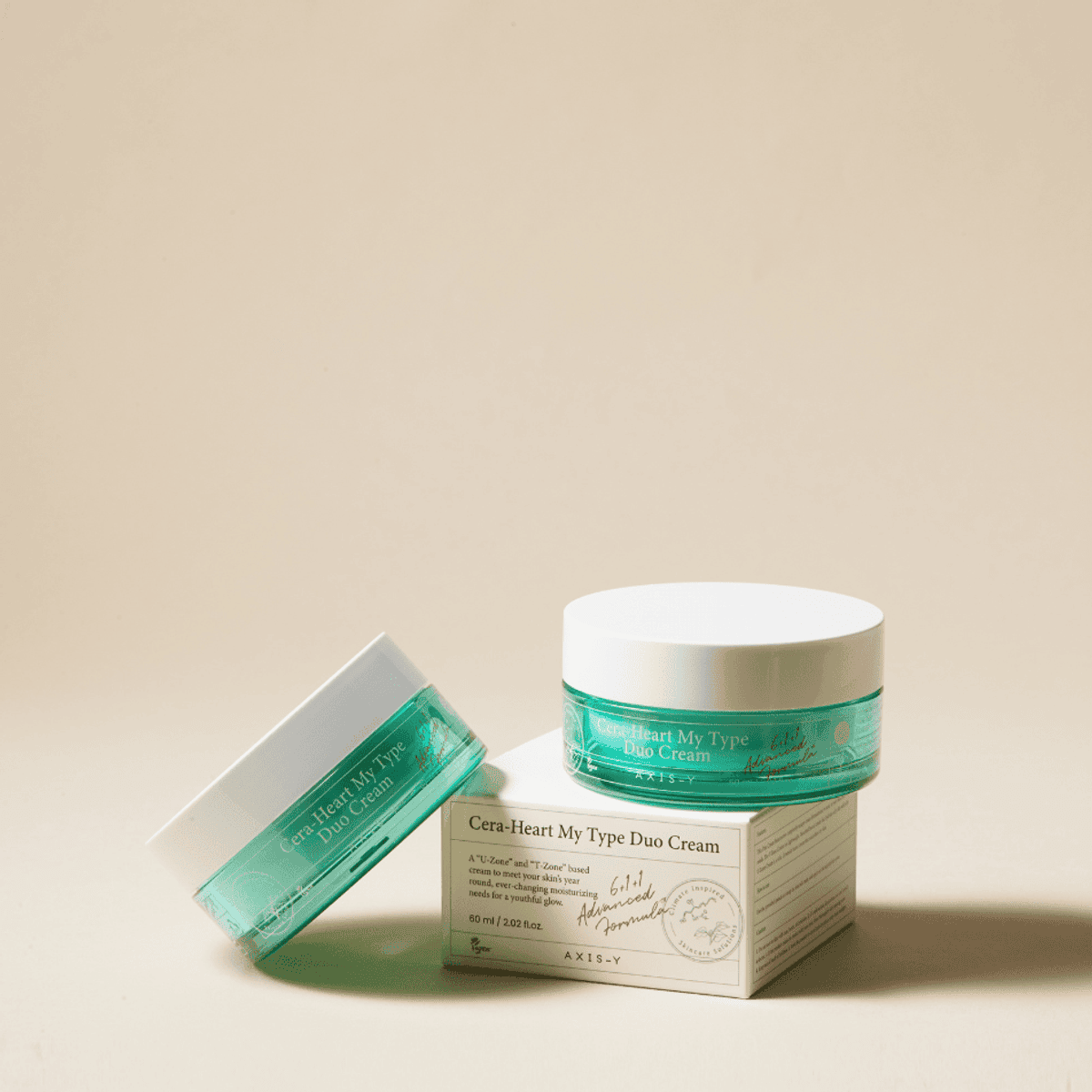 AXIS-Y Cera-Heart My Type Duo Cream is a dual-function moisturizer designed for T-zone and U-zone skin concerns. It features a 6+1+1 Advanced Formula, offering a youthful glow and tailored hydration for combination skin. Vegan and cruelty-free, it uses EWG certified Green Grade ingredients.