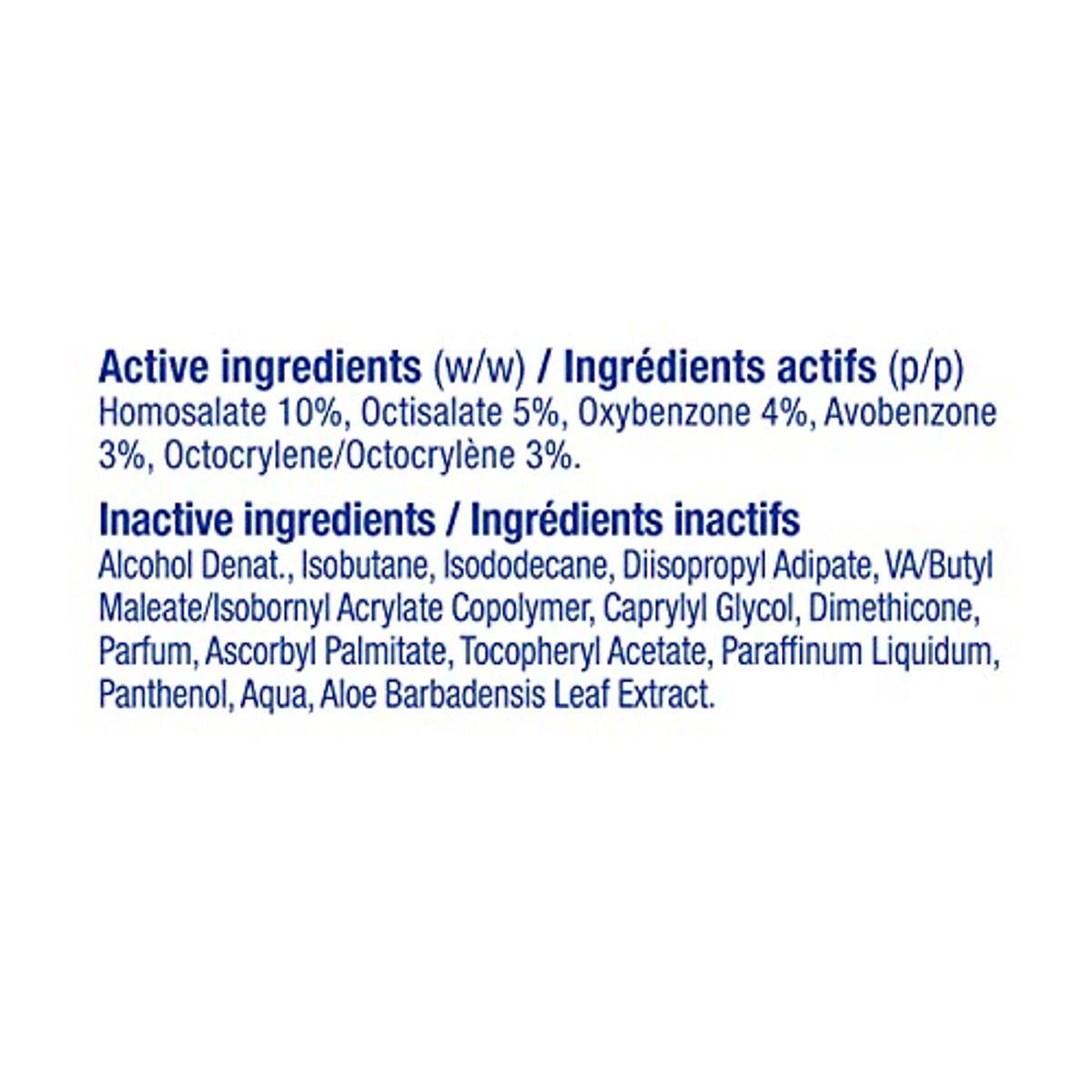 Homosalate 10%, Octisalate 5%, Oxybenzone 4%, Avobenzone 3%, Octocrylene 3%, Alcohol Denat., Isobutane, Isododecane, Diisopropyl Adipate, VA/Butyl Maleate/Isobornyl Acrylate Copolymer, Caprylyl Glycol, Dimethicone, Parfum, Ascorbyl Palmitate, Tocopheryl Acetate, Paraffinum Liquidum, Panthenol, Aqua, Aloe Barbadensis Leaf Extract.