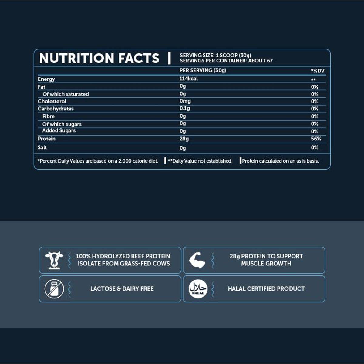 Hydrolyzed Beef Protein Isolate, Acid (Citric Acid), Flavouring, Sweetener (Sucralose), Colour (Brilliant Blue FCF). (May contain traces of milk).