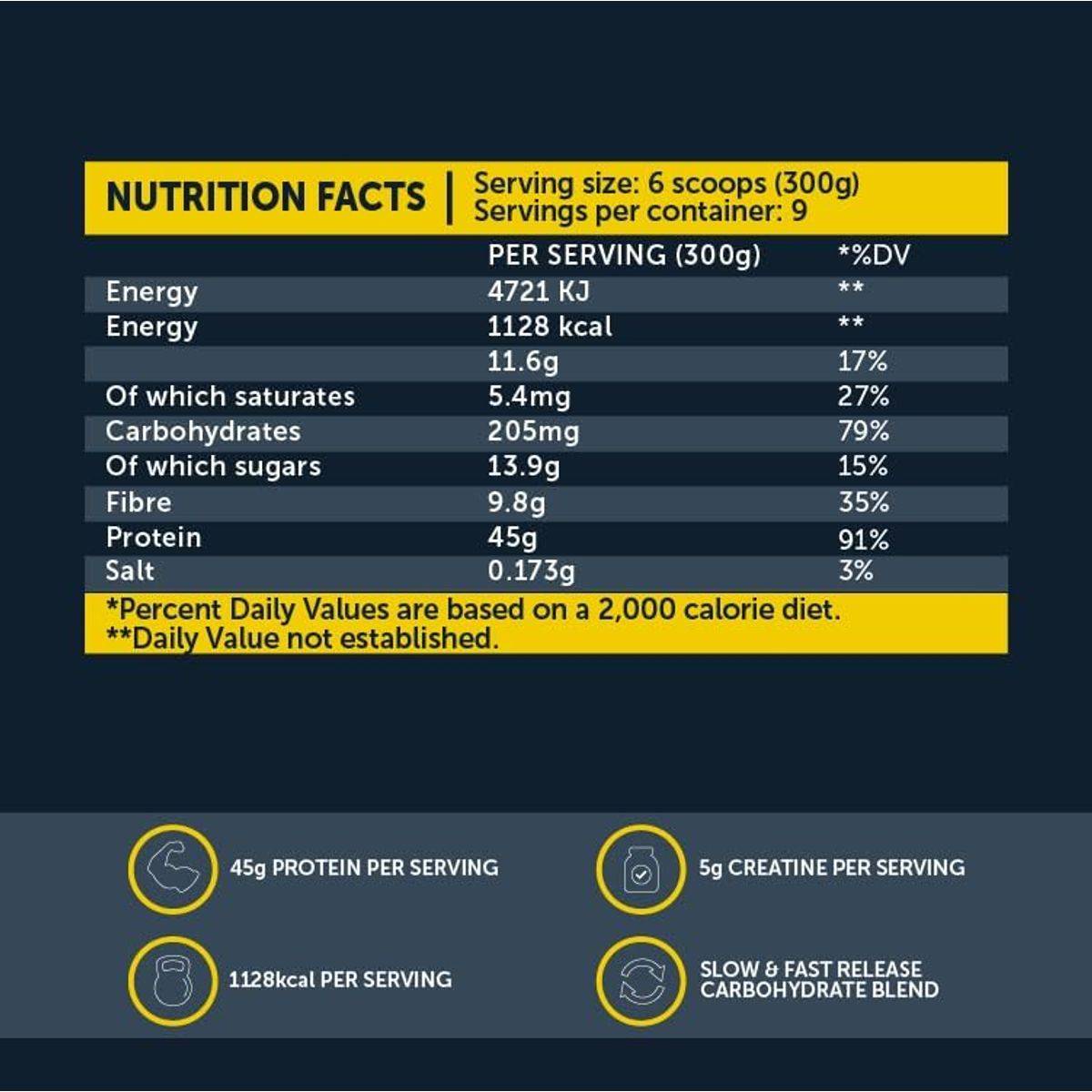 Carbohydrate Blend (100% Ultra-Fine Oat Powder, Maltodextrin, Dextrose), Whey Protein Concentrate, Milk Protein Concentrate, Whey Protein Isolate, Cocoa Powder, Creatine Monohydrate, Mct Oil.