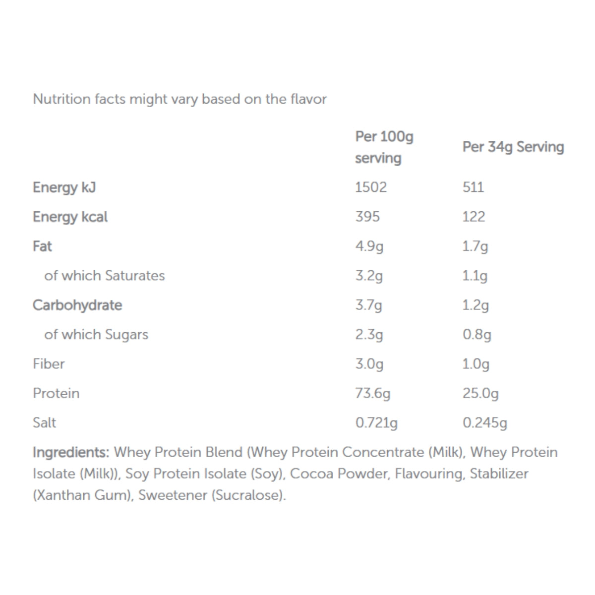 Protein Blend (Whey Protein Concentrate, Whey Protein Isolate, Soy Isolate Protein), Cocoa Powder, Flavoring, Stabilizer, Sweetener (Sucralose).