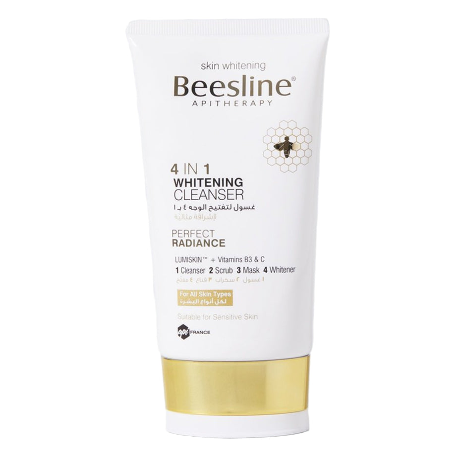 Beesline 4 In 1 Whitening Cleanser combines cleansing, exfoliating, and whitening actions with a weekly mask for radiant skin. Suitable for all skin types.