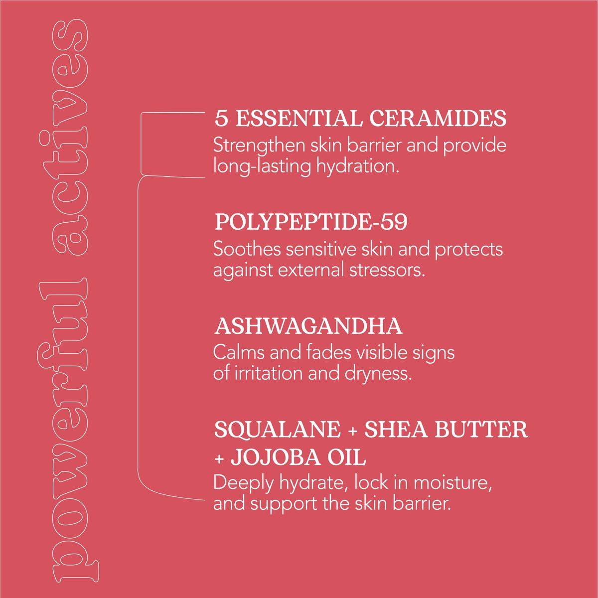 This non-greasy cream is ideal for dry and reactive skin, enhancing the skin's barrier with 5 essential ceramides. It reduces redness with polypeptide-59 and ashwagandha, and hydrates with squalane, shea butter, and jojoba oil. Fragrance-free and non-comedogenic, it is dermatologically tested for sensitive skin.