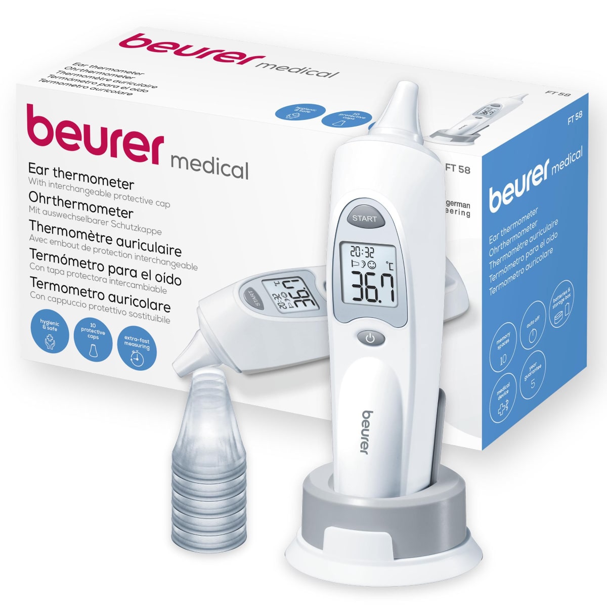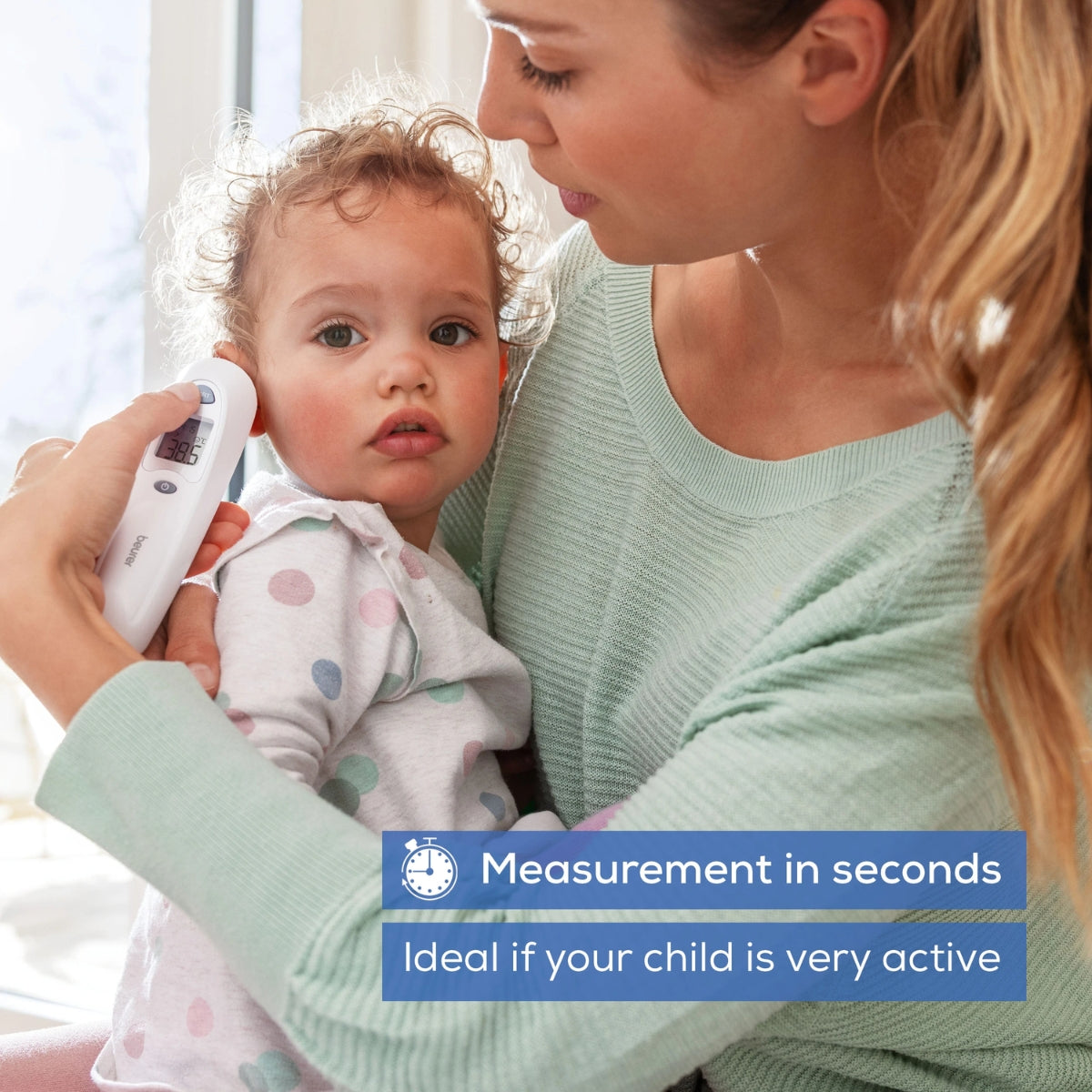 The ear thermometer features an ejection mechanism for the protective cap, making it ideal for hygienic and safe measurements. In addition, the temperature of an object can be measured and the room temperature displayed.