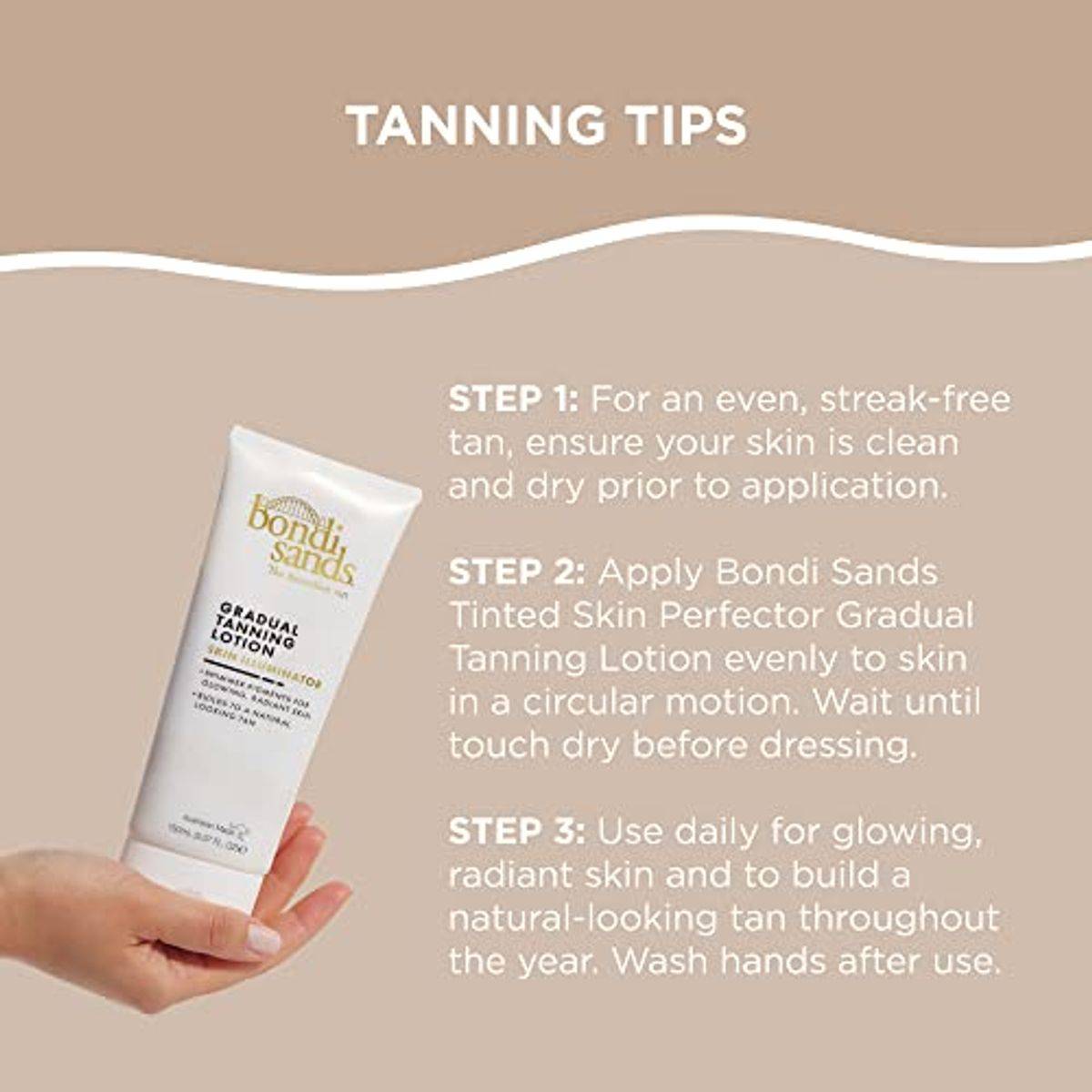 Apply evenly to skin in a circular motion. Wait until touch dry before dressing. Use daily to build tan. Wash hands after use.