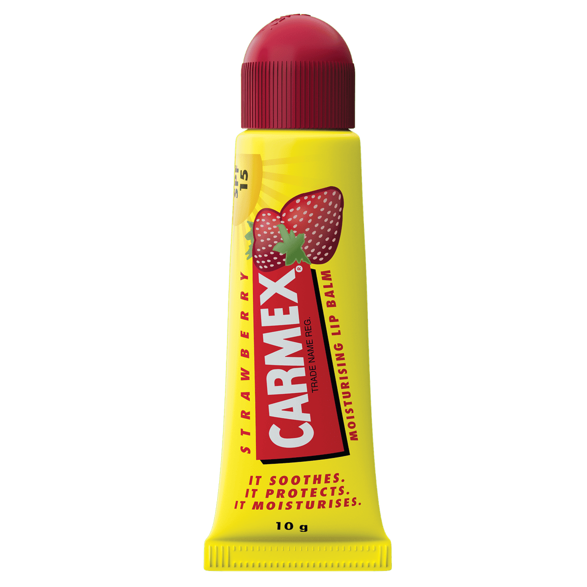 Carmex Lip Balm Tube Strawberry 10g offers a unique formula that soothes, moisturizes, and relieves lips, resulting in soft, healthy-looking lips. It is available in squeezable tubes and sticks, providing long-lasting relief for dry, chapped lips by soothing, protecting, and moisturizing.