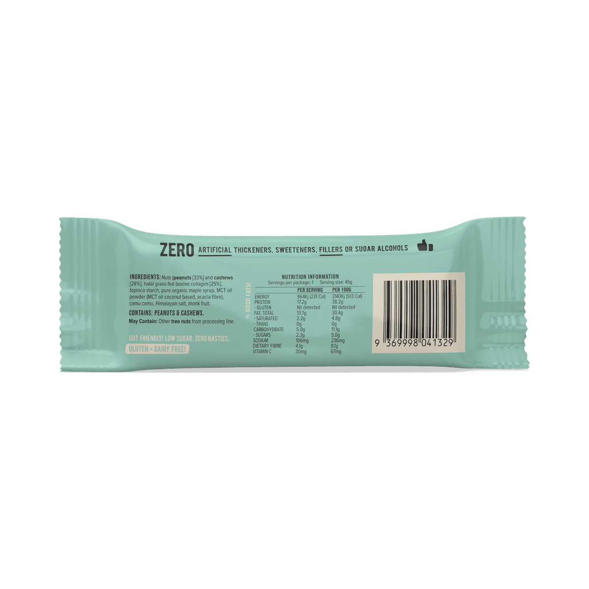 Nuts (Peanuts [33%]) And Cashews [28%], Halal Grass Fed Bovine Collagen [25%], Tapioca Starch, Pure Organic Maple Syrup, Mct Oil Powder (Mct Oil Coconut Based, Acacia Fibre), Camu Camu, Himalayan Salt, Monk Fruit.
