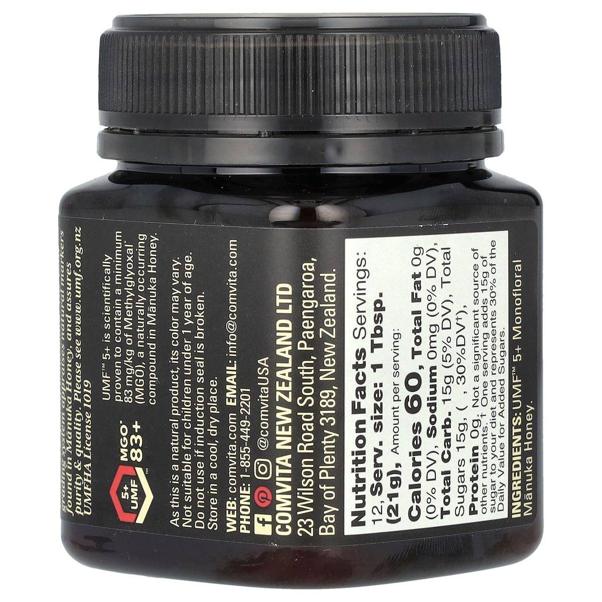 Comvita Manuka Honey UMF 5+ is a raw, wild, and unpasteurized honey from New Zealand. Certified by the UMF Honey Association, it contains MGO 83+, supporting immune health and digestive wellness.