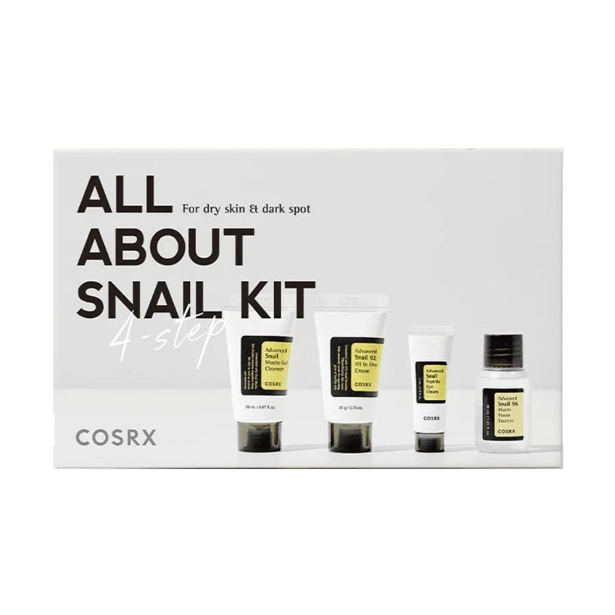 COSRX is a prominent K-Beauty brand. This is a travel or trial kit featuring four of the brand's popular products from the Snail Mucin line, known for their moisturizing and repairing benefits.