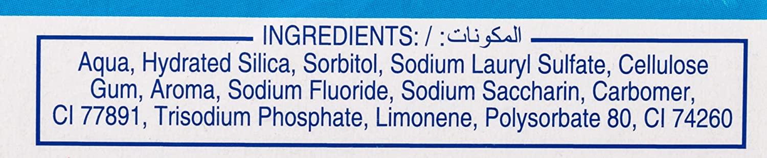 Active: Sodium Fluoride ($sim ext{0.243%}$). Key Inactive: Water, Sorbitol, Hydrated Silica, Sodium Lauryl Sulfate, Flavor, Cellulose Gum, Saccharin.