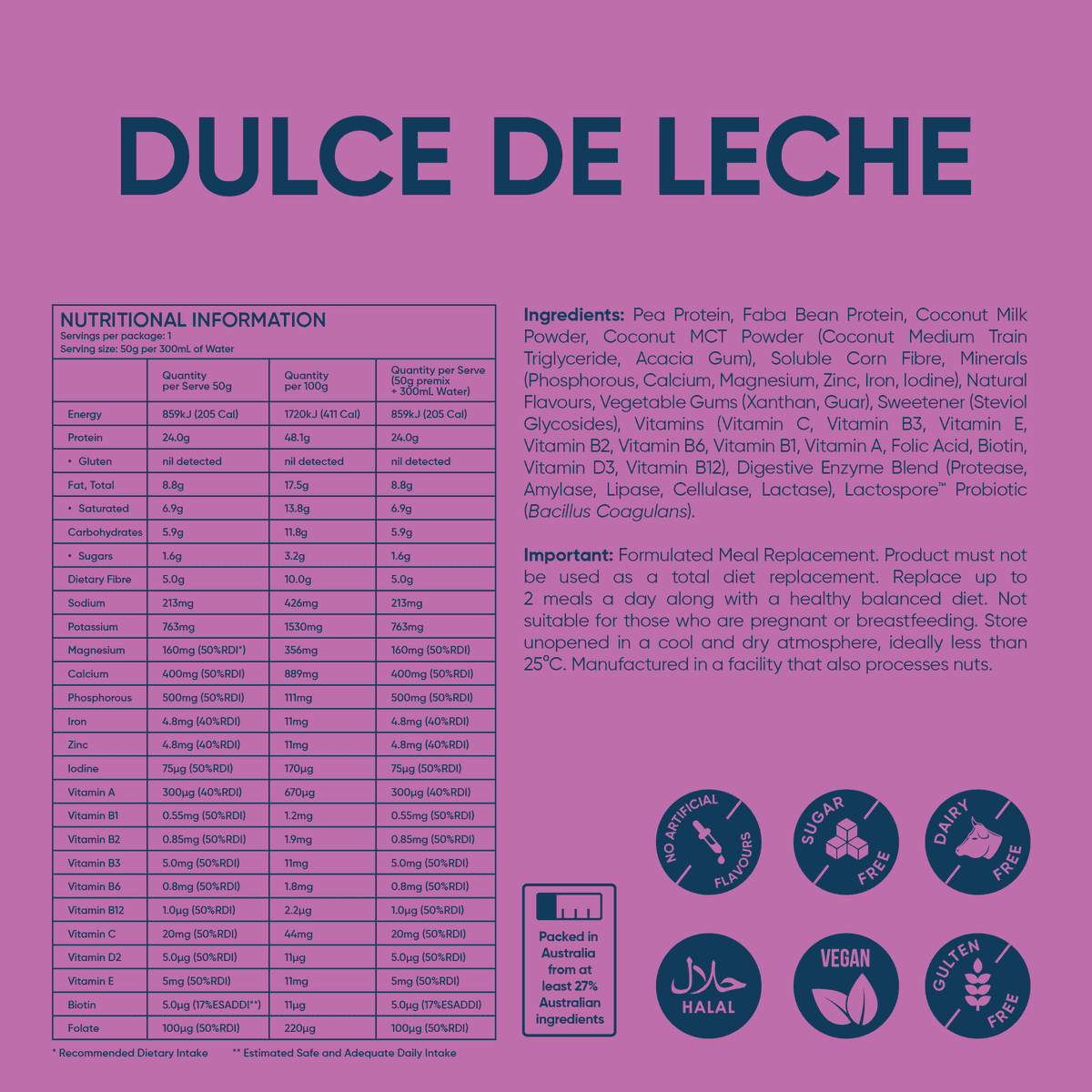 Pea Protein, Faba Bean Protein, Coconut Milk Powder, Coconut MCT Powder (Coconut Medium Train Triglyceride, Acacia Gum), Soluble Corn Fibre, Minerals (Phosphorous, Calcium, Magnesium, Zinc, Iron, Iodine), Natural Flavours, Vegetable Gums (Xanthan, Guar), Sweetener (Steviol Glycosides), Vitamins (Vitamin C, Vitamin B3, Vitamin E, Vitamin B2, Vitamin B6, Vitamin B1, Vitamin A, Folic Acid, Biotin, Vitamin D3, Vitamin B12), Digestive Enzyme Blend (Protease, Amylase, Lipase, Cellulase, Lactase), Lactospore Probiotic (Bacillus Coagulans).