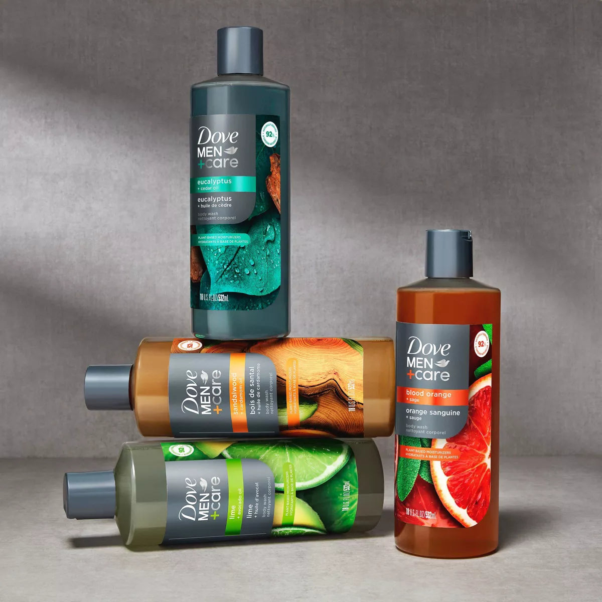 Dove Men+Care Body Wash with Sandalwood & Cardamom Oil hydrates and nourishes skin. Infused with plant-based moisturizers, it offers a refreshing shower experience. Paraben and sulfate-free, it is suitable for all skin types.
