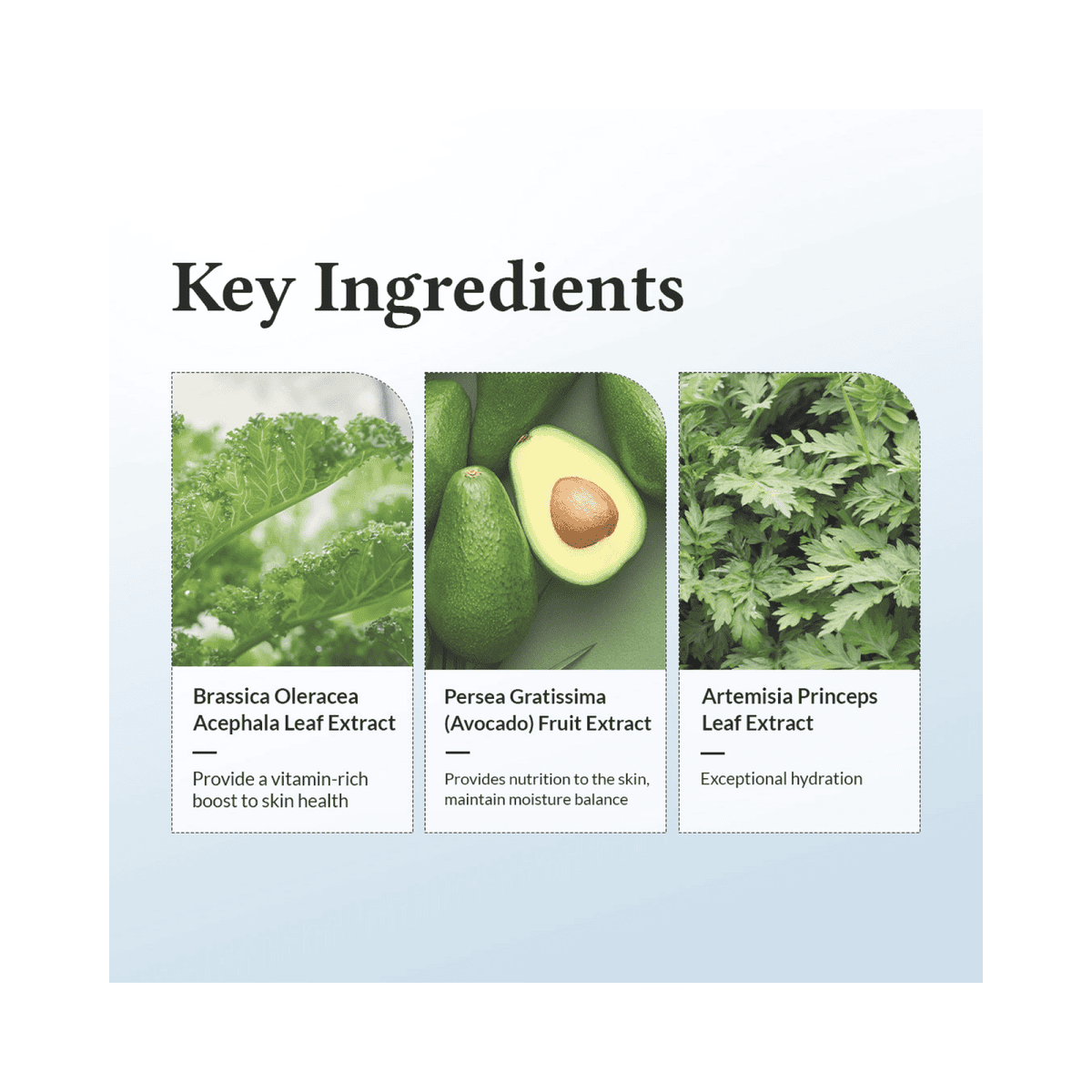 Water, Glycerin, Dipropylene Glycol, Cetearyl Alcohol, Caprylic/Capric Triglyceride, Methyl Trimethicone, Hydrogenated Polydecene, 1,2-Hexanediol, Phenyl Trimethicone, Vegetable Oil, Dimethicone/Vinyl Dimethicone Crosspolymer, Glyceryl Stearate SE, Artemisia Princeps Leaf Extract, Persea Gratissima (Avocado) Fruit Extract, Brassica Oleracea Acephala Leaf Extract, Laminaria Japonica Extract, Eclipta Prostrata Leaf Extract, Beta Vulgaris (Beet) Root Extract, Coptis Japonica Root Extract, Hydrolyzed Gardenia Florida Extract, Paeonia Albiflora Flower Extract, Hydrogenated Lecithin, Pelargonium Graveolens Flower Oil, Sodium Hyaluronate, Camellia Sinensis Seed Oil, Argania Spinosa Kernel Oil, Palmitic Acid, Cetearyl Olivate, Sorbitan Olivate, C12-16 Alcohols, Behenyl Alcohol, Stearic Acid, Microcrystalline Cellulose, Cetearyl Glucoside, Ethylhexylglycerin, C12-15 Alkyl Benzoate, Ceramide NP, Squalane, Ammonium Acryloyldimethyltaurate/VP Copolymer, Panthenol, Polyglyceryl-10 Myristate, Glyceryl Polymethacrylate, Cellulose Gum, Cholesterol, Fructooligosaccharides, Disodium EDTA, Beta-Glucan, Carnosine, Inulin Lauryl Carbamate, Hydrolyzed Hyaluronic Acid, Methylpropanediol, Maltodextrin, Guaiazulene, Oligopeptide-1, Arginine, Carbomer, Tocopherol, Dimethylsilanol Hyaluronate, Hydrolyzed Sodium Hyaluronate, Potassium Hyaluronate, Hyaluronic Acid, Sodium Hyaluronate Crosspolymer, Hydroxypropyltrimonium Hyaluronate, Sodium Hyaluronate Dimethiconol, Sodium Acetylated Hyaluronate.