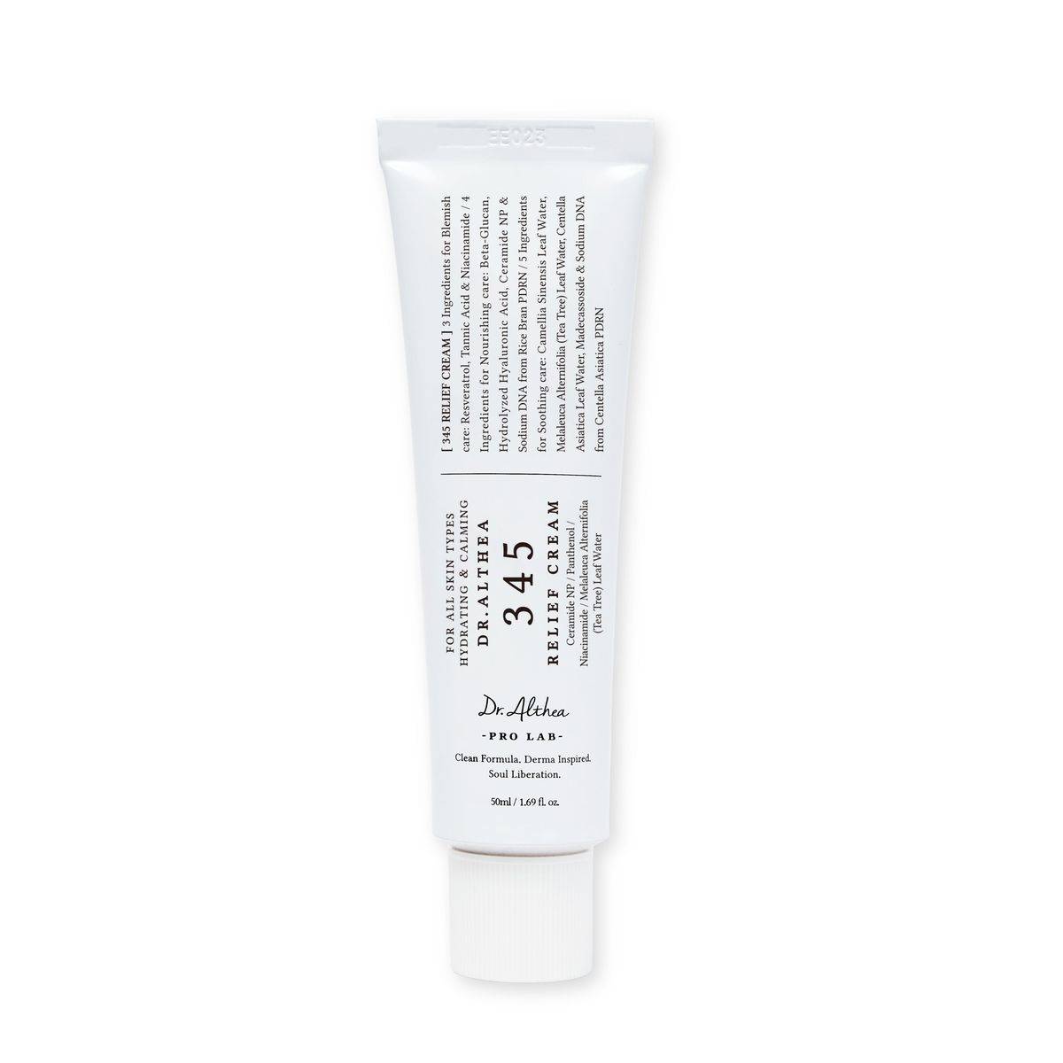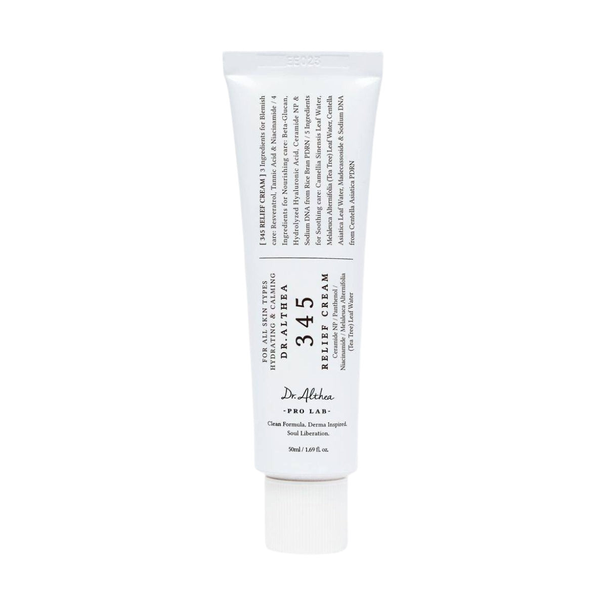 Dr. Althea 345 Relief Cream is a soothing moisturizer designed for all skin types, including sensitive and acne-prone skin. It contains Tea Tree Leaf Water and Niacinamide to reduce redness and irritation, while Ceramide NP locks in moisture. Vegan-certified and clinically tested, it offers relief from blemishes and promotes an even skin tone.