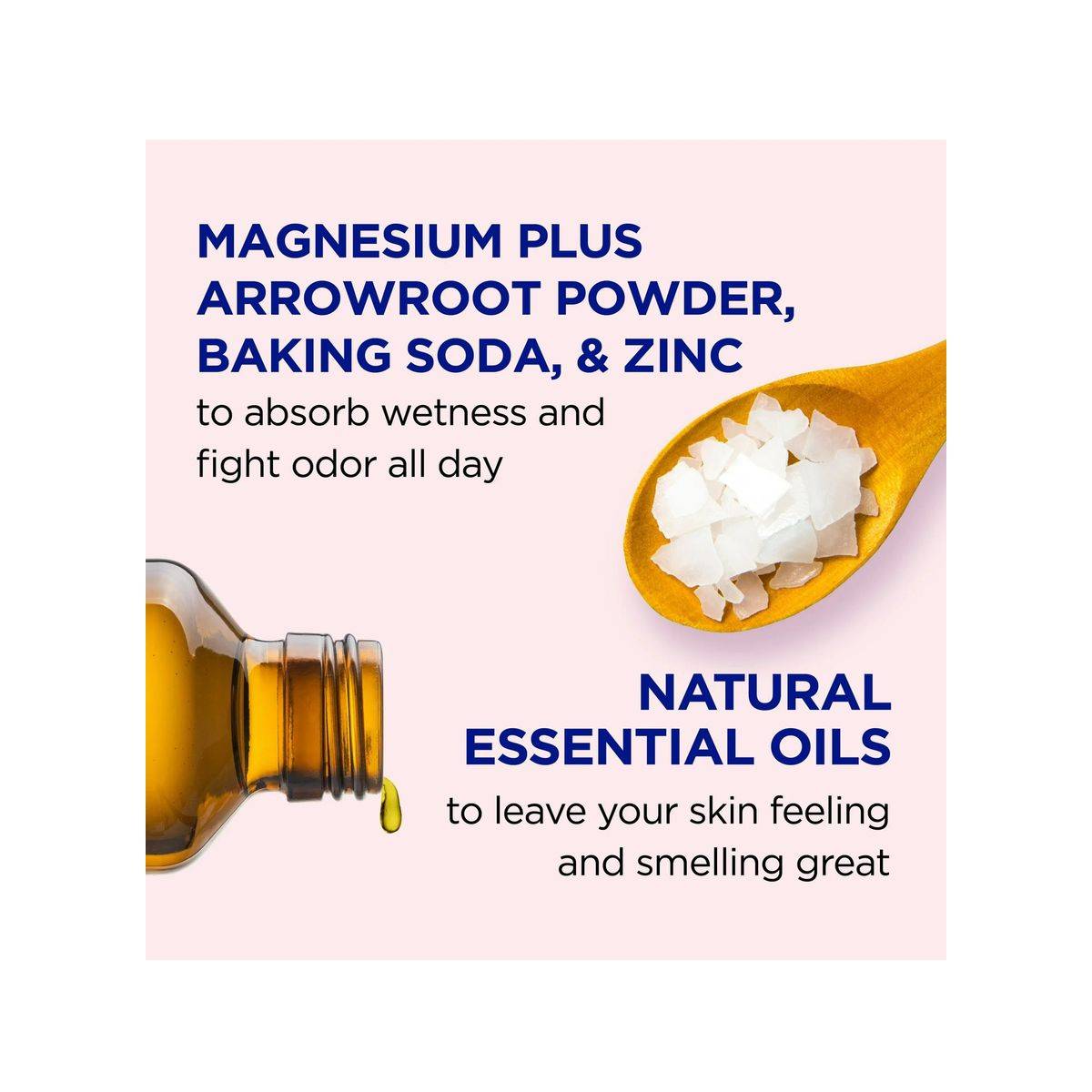 Magnesium Hydroxide, Maranta Arundinacea Root Powder (Arrowroot), Cocos Nucifera (Coconut) Oil, Caprylic/Capric Triglyceride, Stearyl Alcohol, Sodium Bicarbonate (Baking Soda), Hydrogenated Castor Oil, Polyglyceryl-3 Beeswax, Butyrospermum Parkii (Shea) Butter, Zinc Ricinoleate, Fragrance (Parfum), Citrus Aurantium Dulcis (Orange) Peel Oil, Elettaria Cardamomum Seed Oil (Cardamom), Cymbopogon Martini Oil (Palmarosa), Pogostemon Cablin Oil (Patchouli), Glyceryl Caprylate, Glyceryl Undecylenate, Nonfat Dry Milk, Simmondsia Chinensis (Jojoba) Seed Oil, Maltodextrin, Magnesium Sulfate (Epsom Salt), Magnesium Chloride.