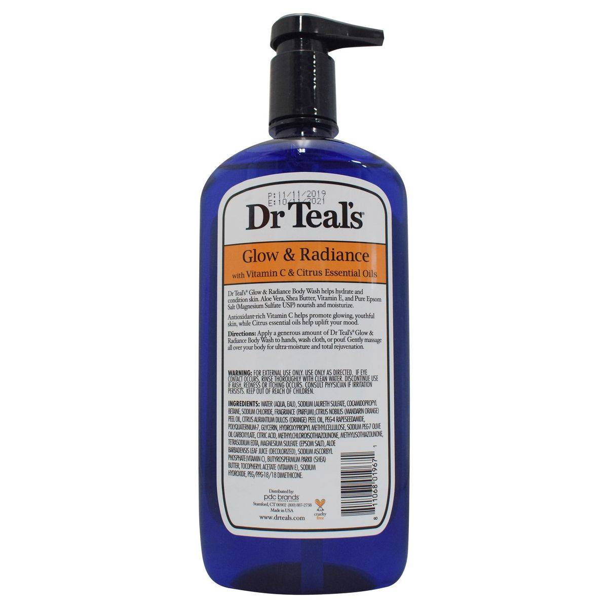Dr Teal's Body Wash with Pure Epsom Salt Glow & Radiance hydrates and conditions skin with Aloe Vera, Shea Butter, and Vitamin E. Vitamin C promotes glowing skin, while citrus essential oils uplift mood. Ideal for daily use.