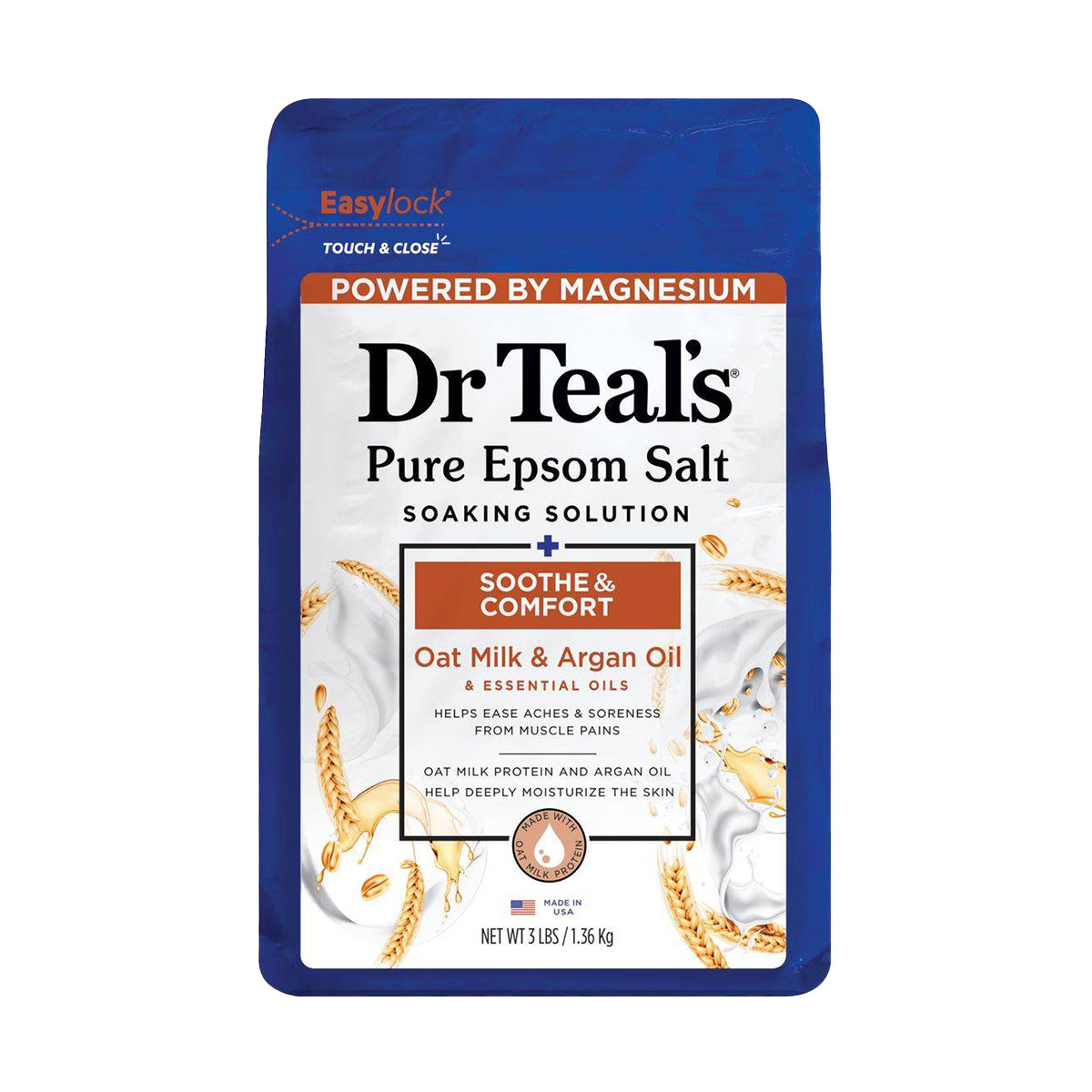 Dr Teal's Pure Epsom Salt Soaking Solution combines therapeutic magnesium sulfate with oat milk and argan oil to soothe muscles and hydrate skin. Ideal for relaxation and enhancing mood.