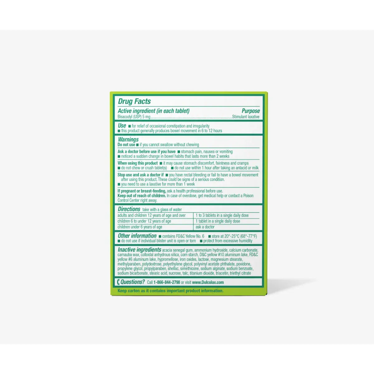 Bisacodyl USP 5mg, Acacia Senegal Gum, Ammonium Hydroxide, Calcium Carbonate, Carnauba Wax, Colloidal Anhydrous Silica, Corn Starch, D&C Yellow #10 Aluminum Lake, FD&C Yellow #6 Aluminum Lake, Hypromellose, Iron Oxides, Lactose, Magnesium Stearate, Methylparaben, Polydextrose, Polyethylene Glycol, Polyvinyl Acetate Phthalate, Povidone, Propylene Glycol, Propylparaben, Shellac, Simethicone, Sodium Alginate, Sodium Benzoate, Sodium Bicarbonate, Stearic Acid, Sucrose, Talc, Titanium Dioxide, Triacetin, Triethyl Citrate.