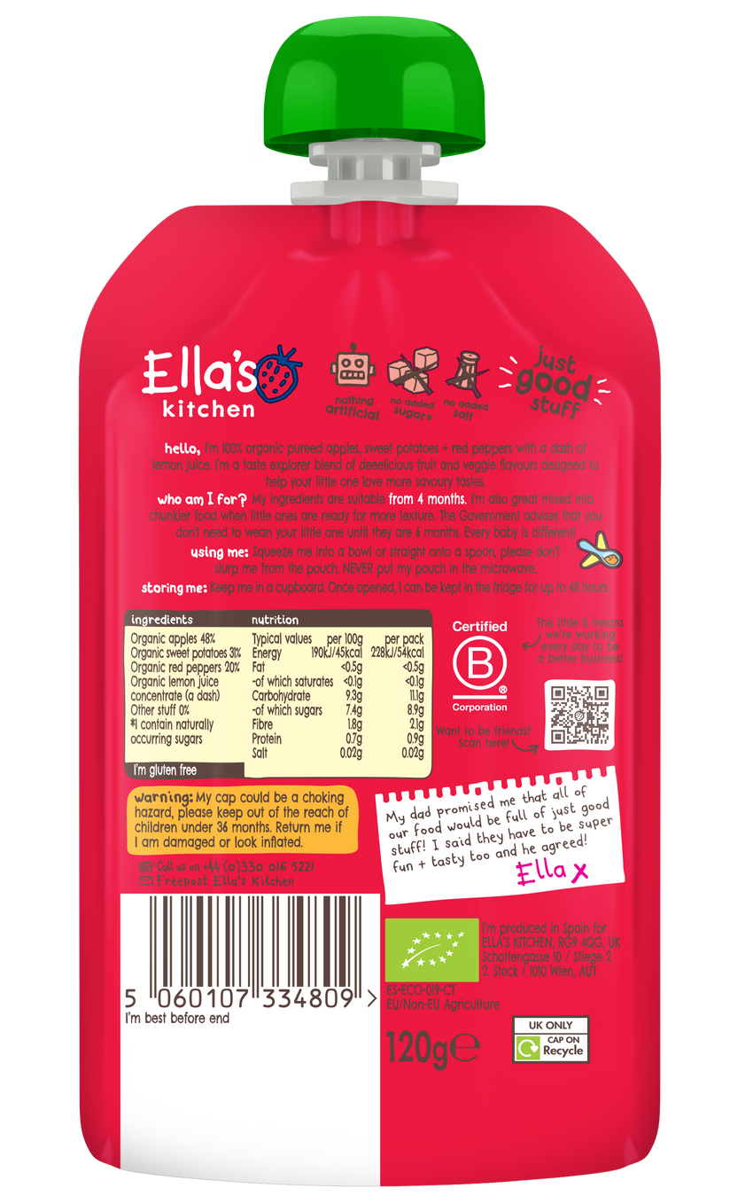 - Ellas Kitchen Organic Puree 4+ Months Red Peppers Sweet Potatoes + Apples 120g