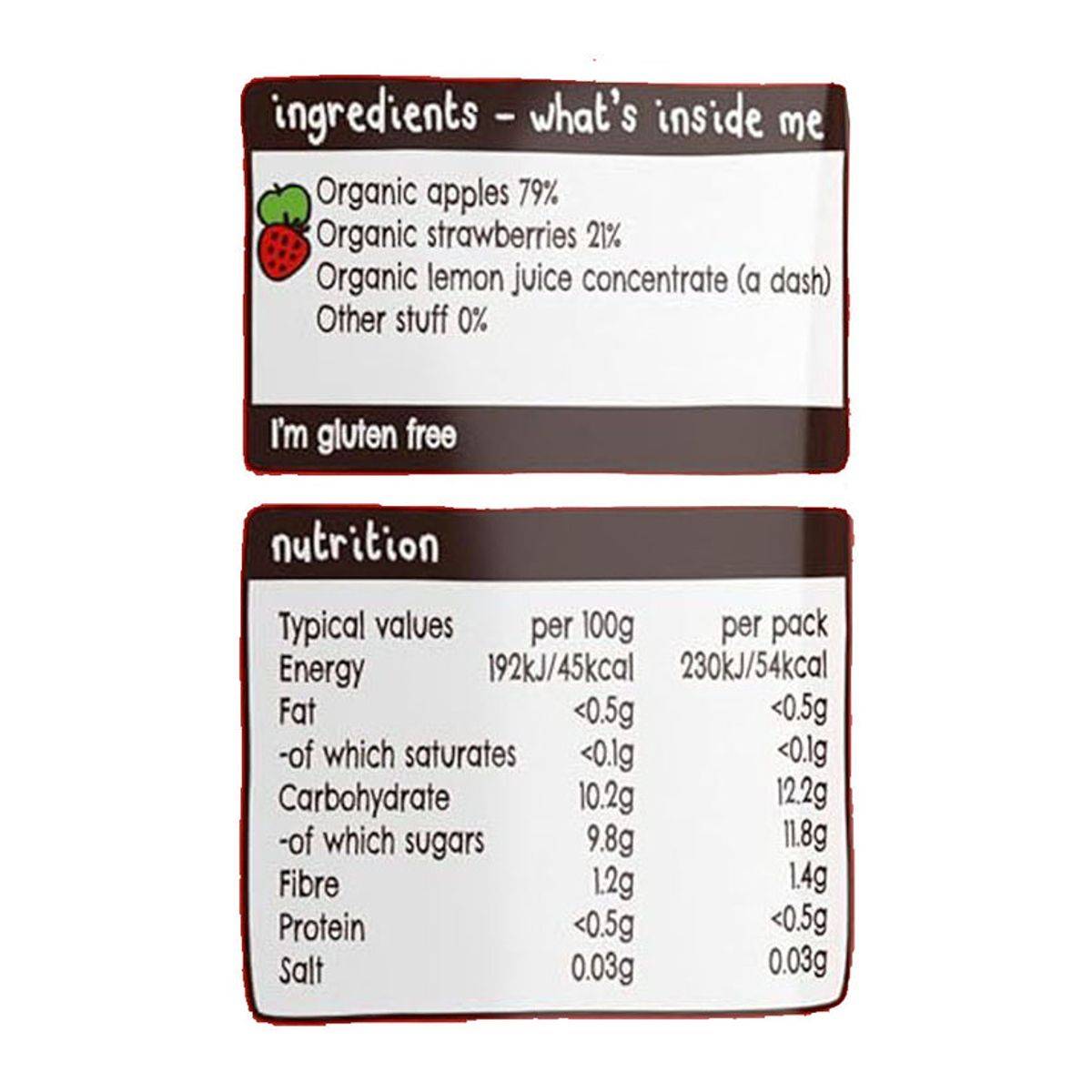 Organic Apples 79%, Organic Strawberries 21%, Organic Lemon Juice Concentrate (A Dash).
