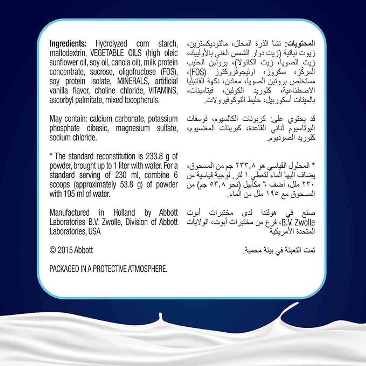 Hydrolyzed corn starch, Maltodextrin, Vegetable oils (high oleic sunflower oil, soy oil, canola oil), Milk protein concentrate, Sucrose, Oligofructose (FOS), Soy protein isolate, Minerals (sodium citrate, potassium citrate, magnesium chloride, potassium chloride, calcium phosphate tribasic, zinc sulfate, ferrous sulfate, manganese sulfate, cupric sulfate, potassium iodide, sodium molybdate, chromium chloride, sodium selenate), Artificial vanilla flavor, Choline chloride, Vitamins (ascorbic acid, calcium pantothenate, vitamin E, niacinamide, pyridoxine hydrochloride, riboflavin, vitamin A palmitate, thiamine hydrochloride, beta carotene, folic acid, phylloquinone, biotin, vitamin D3, cyanocobalamin), Ascorbyl palmitate (antioxidant), Mixed tocopherols (antioxidant). May contain: calcium carbonate, potassium phosphate dibasic, magnesium sulfate, sodium chloride.