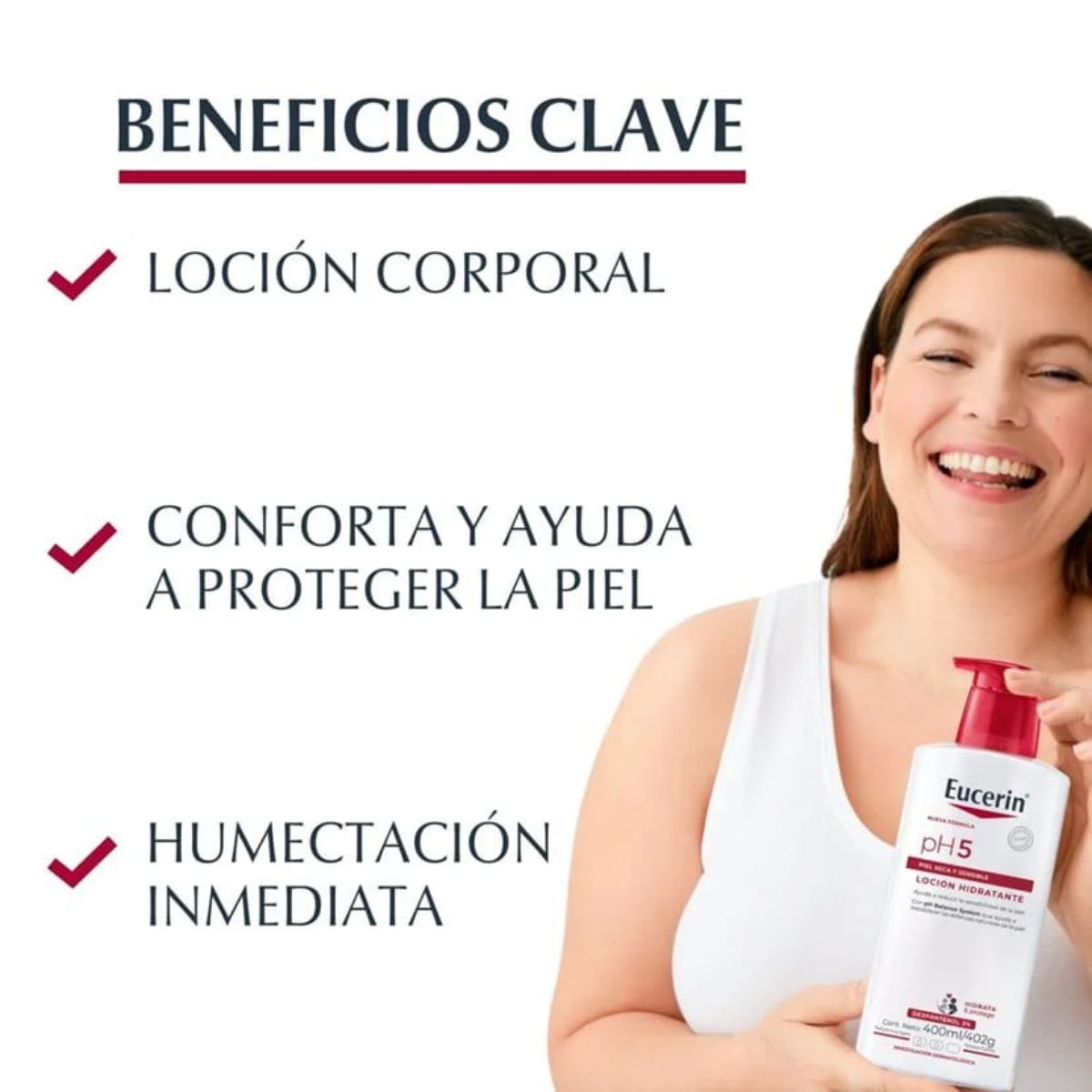 Soothe and protect dry, sensitive skin with Eucerin pH5 Body Lotion, a daily moisturizer specially formulated to reduce skin sensitivity and improve resilience. Infused with Dexpanthenol and Hyaluronic Acid, this nourishing lotion delivers immediate, long-lasting hydration, helping to restore the skins natural moisture balance. Eucerins unique pH Balance System supports the skins protective barrier, making it less prone to irritation and dryness. Suitable for allergy-prone and sensitive skin, including children aged 3+, the ultra-gentle formula absorbs quickly, leaving skin soft, smooth, and comforted without feeling greasy. Clinically and dermatologically proven, this lotion is ideal for everyday use and available in both scented and fragrance-free versions. Complete your skincare routine with the full Eucerin pH5 range, including Shower Gel, Body Oil, and Lip Care.