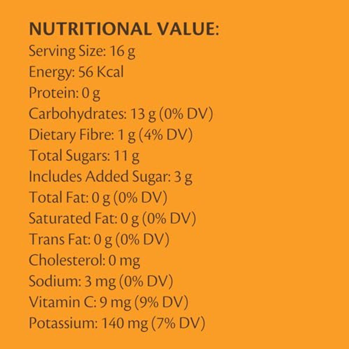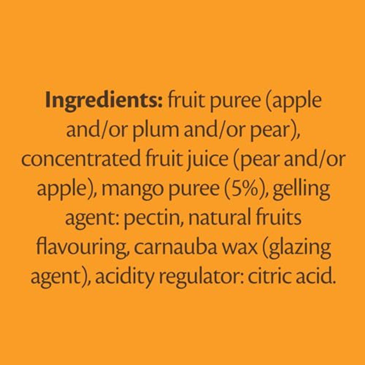 Fruit Puree (Apple And/Or Plum And/Or Pear), Concentrated Fruit Juice (Pear And/Or Apple), Mango Puree (5%), Gelling Agent: Pectin, Natural Fruits Flavouring, Carnauba Wax (Glazing Agent), Acidity Regulator: Citric Acid.