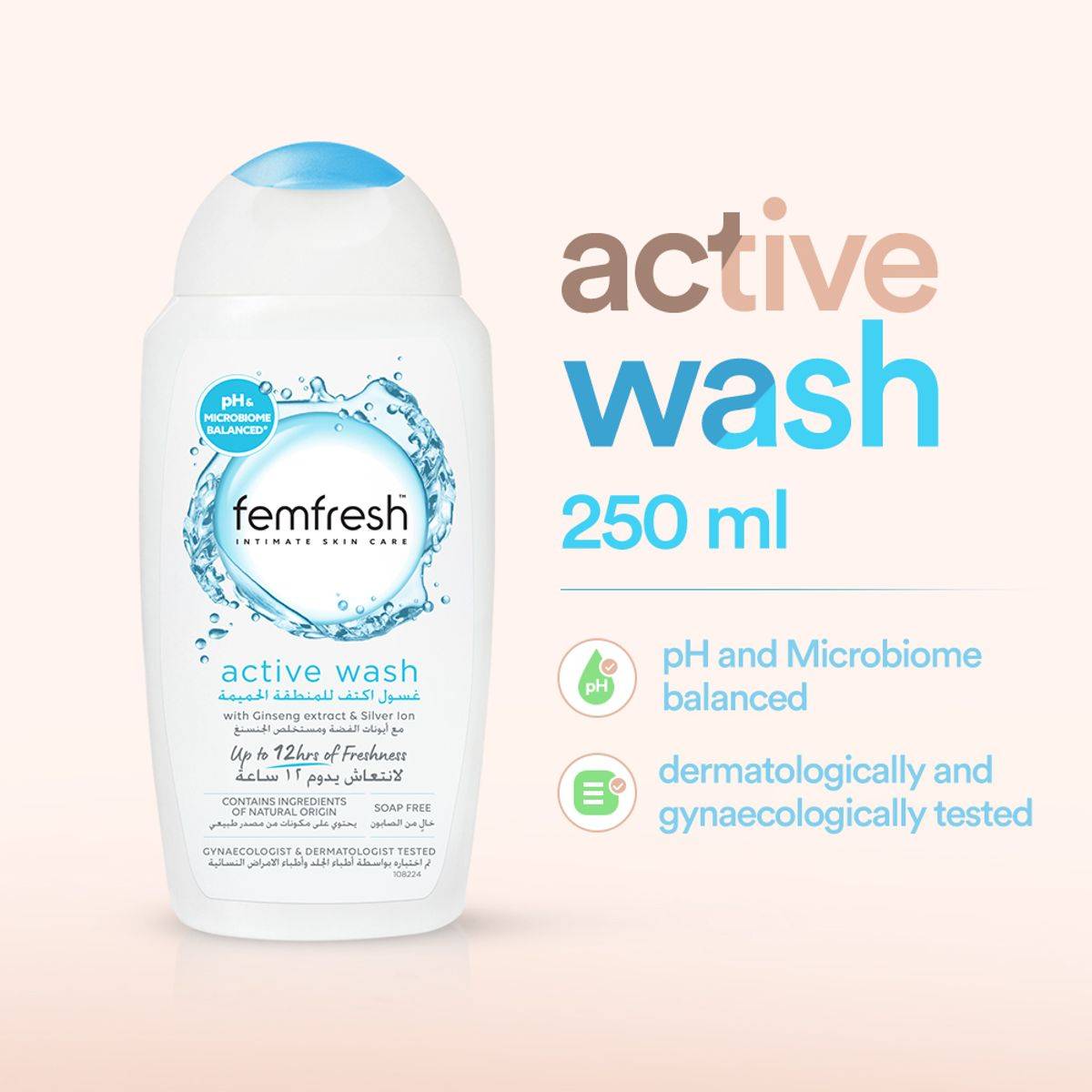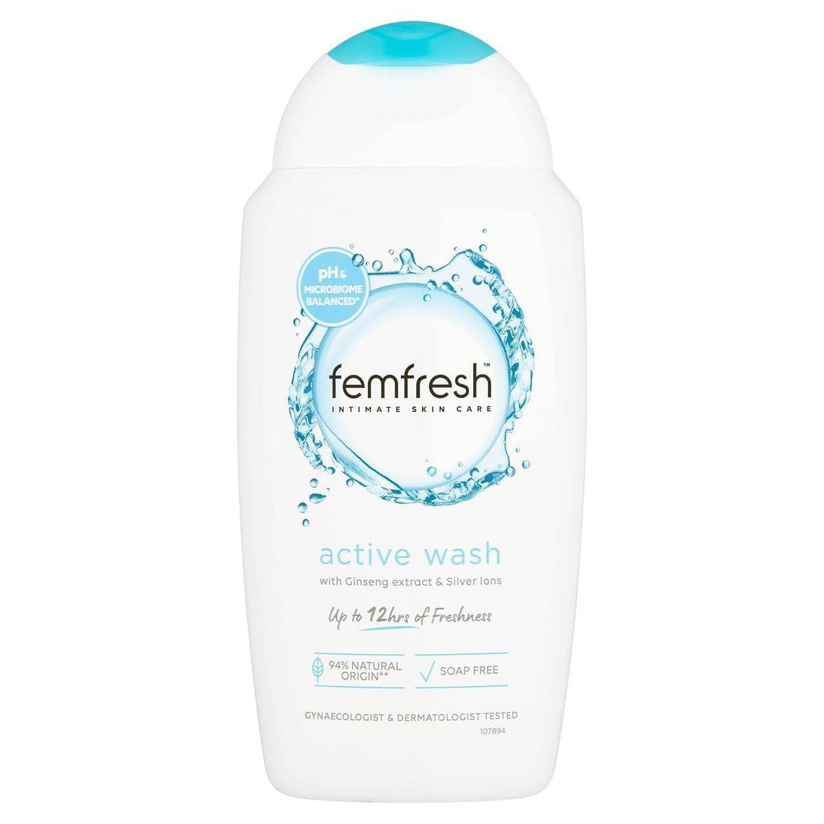 Femfresh Intimate Active Fresh Wash is a gentle, pH-balanced formula designed for daily use. Enriched with silver ions and ginseng extract, it hydrates and refreshes intimate skin, providing up to 12 hours of freshness. Dermatologically and gynaecologically tested, it is soap-free and suitable for sensitive skin.