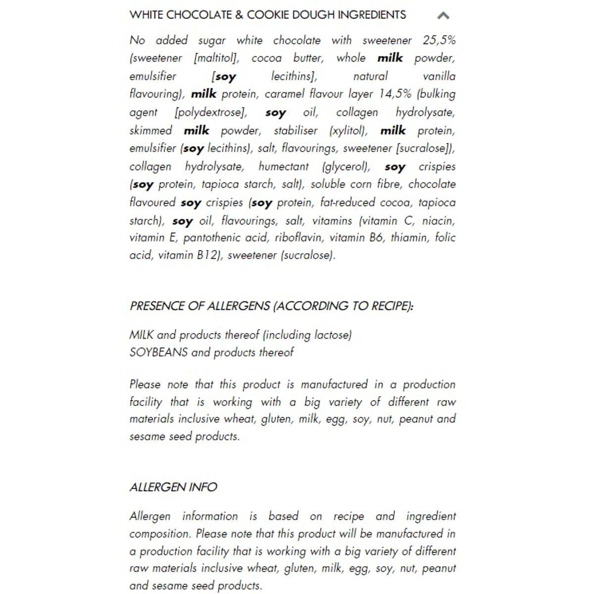 No added sugar white chocolate with sweetener (maltitol), cocoa butter, whole milk powder, emulsifier (soy lecithins), natural flavouring, milk protein, caramel flavour layer (bulking agent [polydextrose], soy oil, collagen hydrolysate, skimmed milk powder, stabiliser (xylitol), milk protein, emulsifier (soy lecithins), salt, flavourings, sweetener (sucralose)), collagen hydrolysate, humectant (glycerol), soy crispies (soy protein, tapioca starch, salt), soluble corn fibre, chocolate flavoured soy crispies (soy protein, fat-reduced cocoa, tapioca starch), soy oil, flavourings, salt, vitamins (vitamin C, niacin, vitamin E, pantothenic acid, riboflavin, vitamin B6, thiamin, folic acid, vitamin B12), sweetener (sucralose).