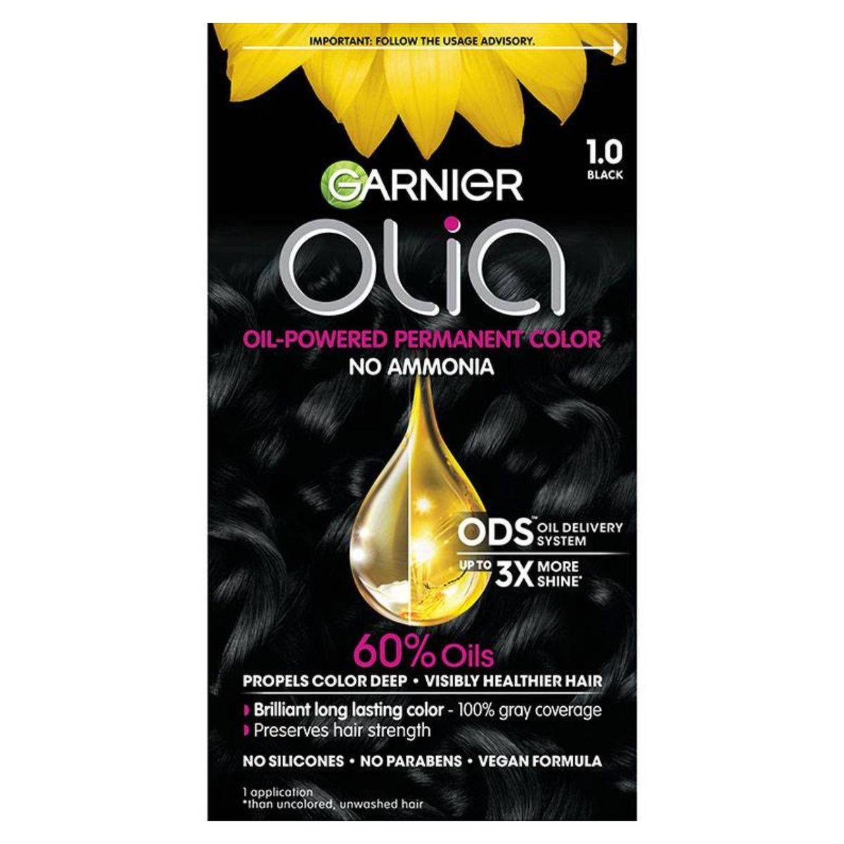 Garnier Olia 1.0 Deep Black is an ammonia-free permanent hair color that provides 100% gray coverage. Enriched with 60% natural flower oils, it leaves hair hydrated, silky, and up to 3X shinier. Suitable for all hair textures, it offers a delicate floral fragrance for a luxurious coloring experience.