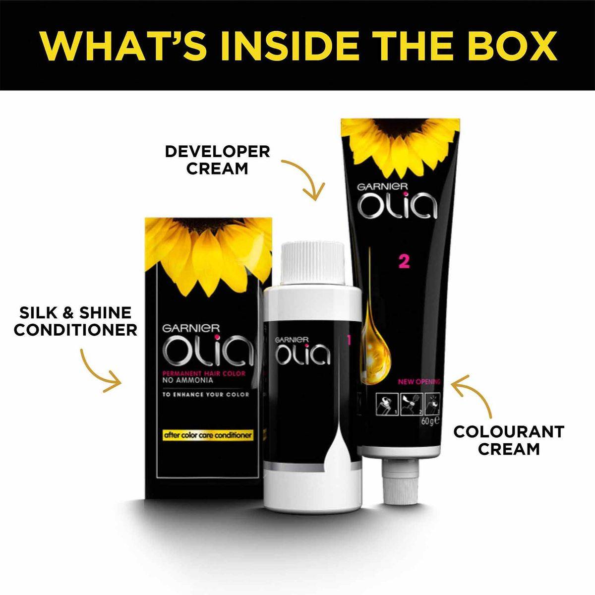 Garnier Olia 7.31 Almond is a permanent hair color enriched with 60% natural-origin flower oils. It offers ammonia-free coloring, providing vibrant color and up to 100% grey coverage. The formula improves hair quality, delivering intense care and 2x more shine without drying out the hair.