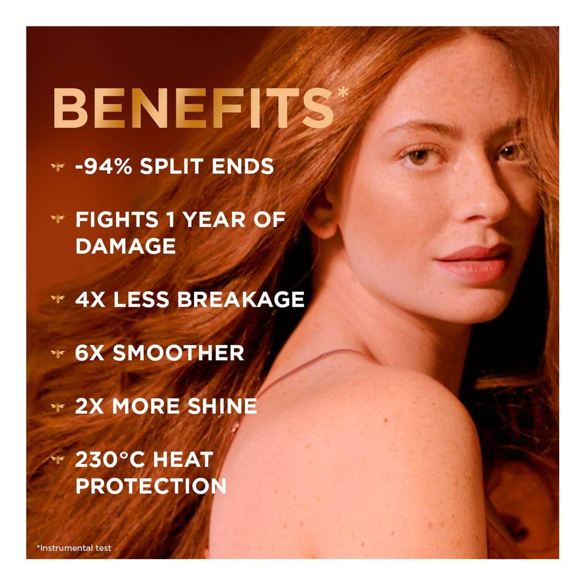 Garnier Ultra Doux Honey Treasure Serum is a repairing hair serum designed to reduce split ends by 94%. It offers 230°C heat protection, making hair 6x smoother and 2x shinier. Ideal for daily use on damp or dry hair.