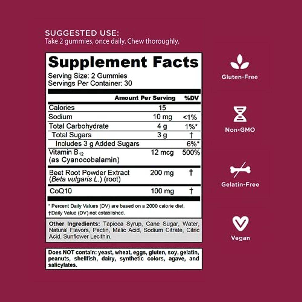 Tapioca Syrup, Cane Sugar, Water, Natural Flavors, Pectin, Malic Acid, Sodium Citrate, Citric Acid, Sunflower Lecithin, Beet Root Powder Extract, CoQ10, Vitamin B12.
