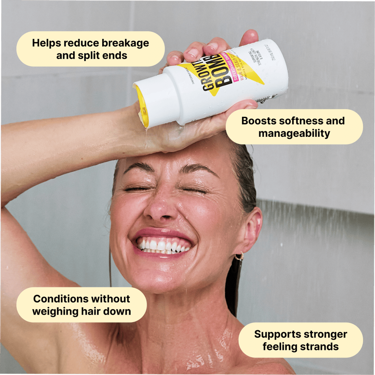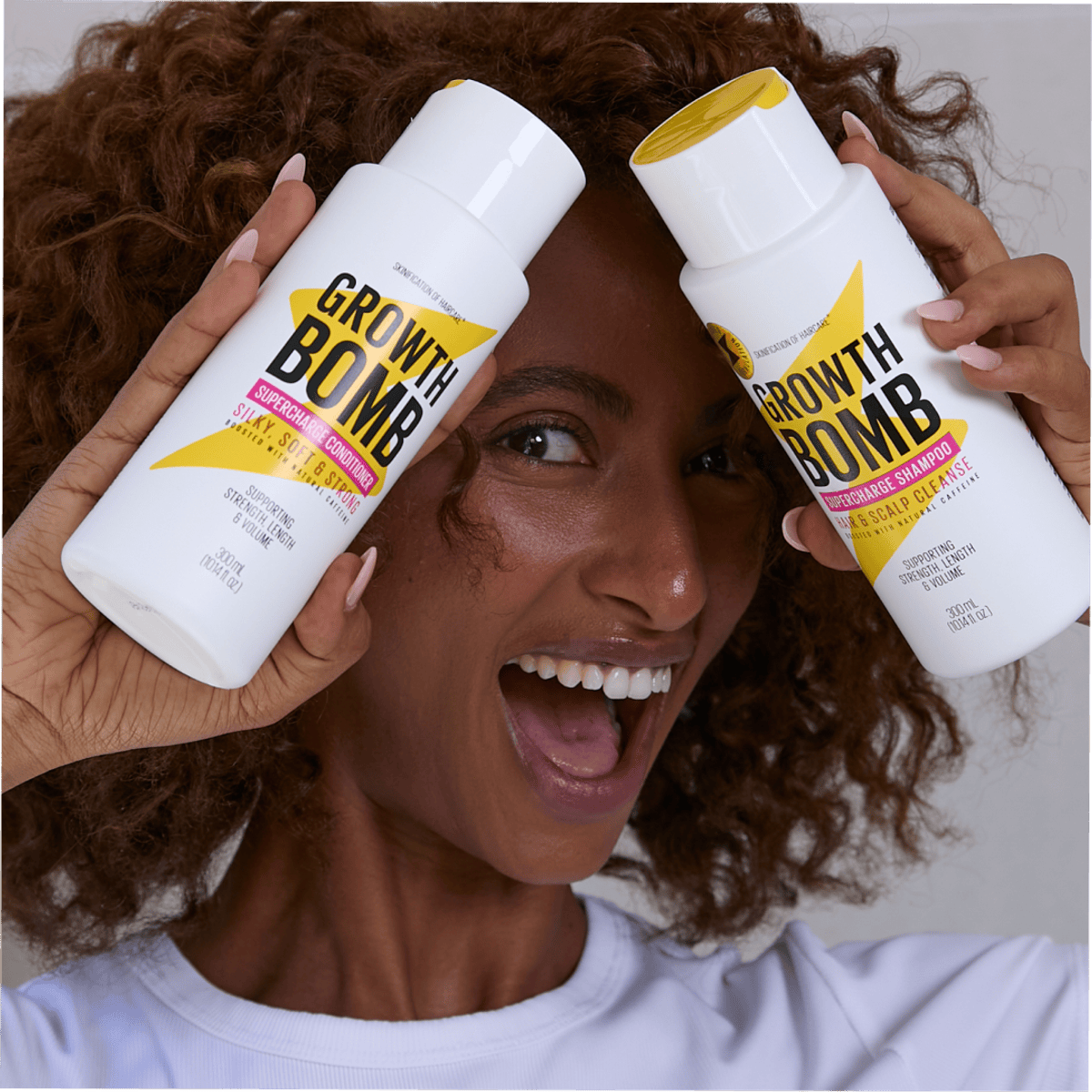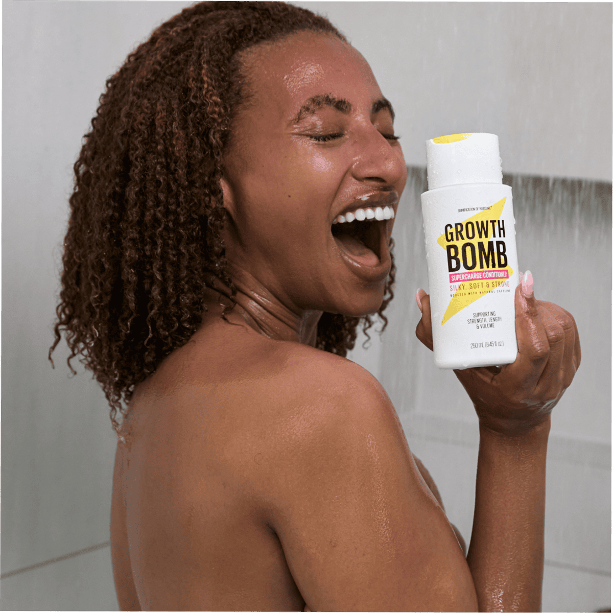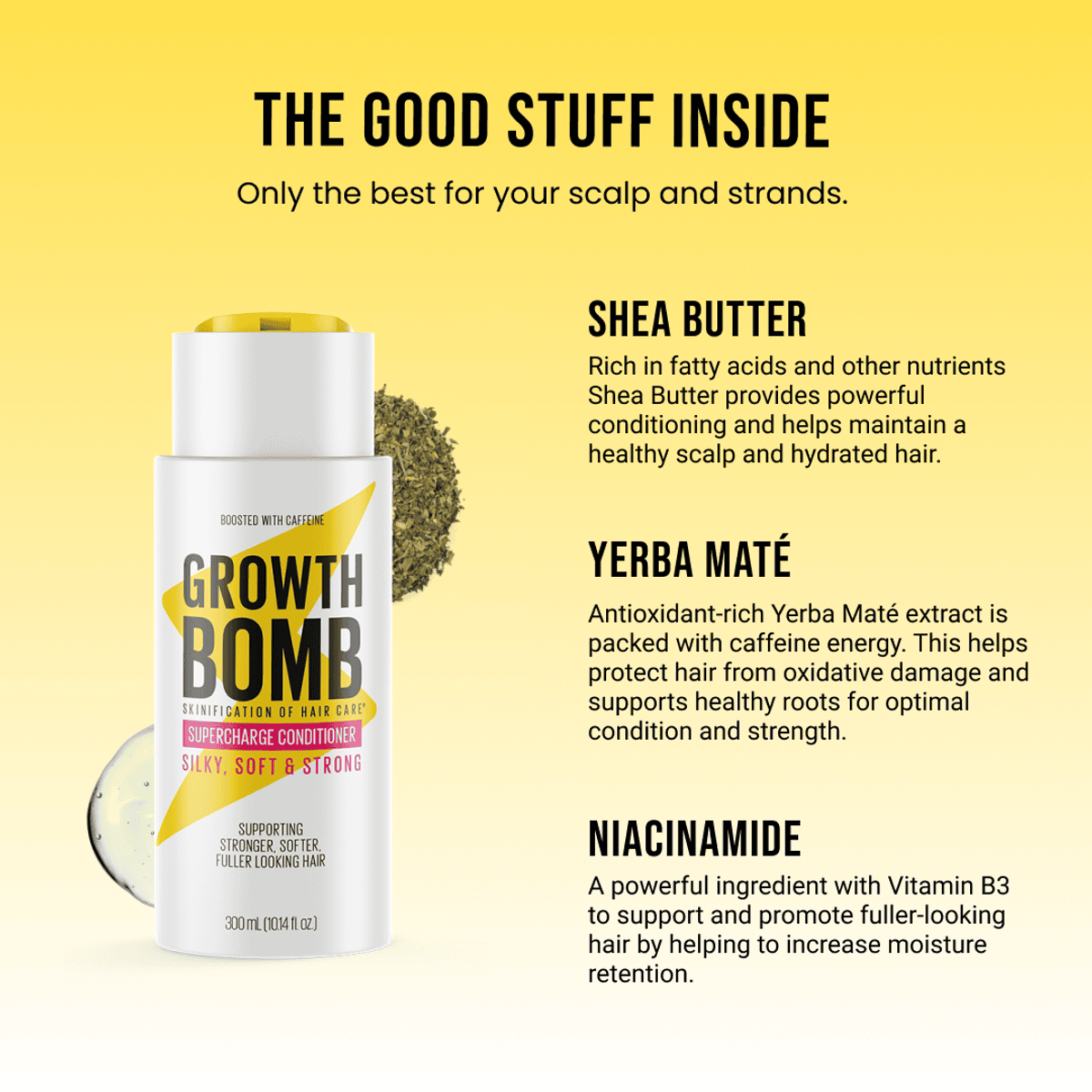 Growth Bomb Hair Growth Conditioner is infused with Yerba Maté, rich in antioxidants, to energize and protect hair. Shea Butter and Niacinamide support hydration and fuller-looking hair. Ideal for daily use to enhance strength, length, and volume.