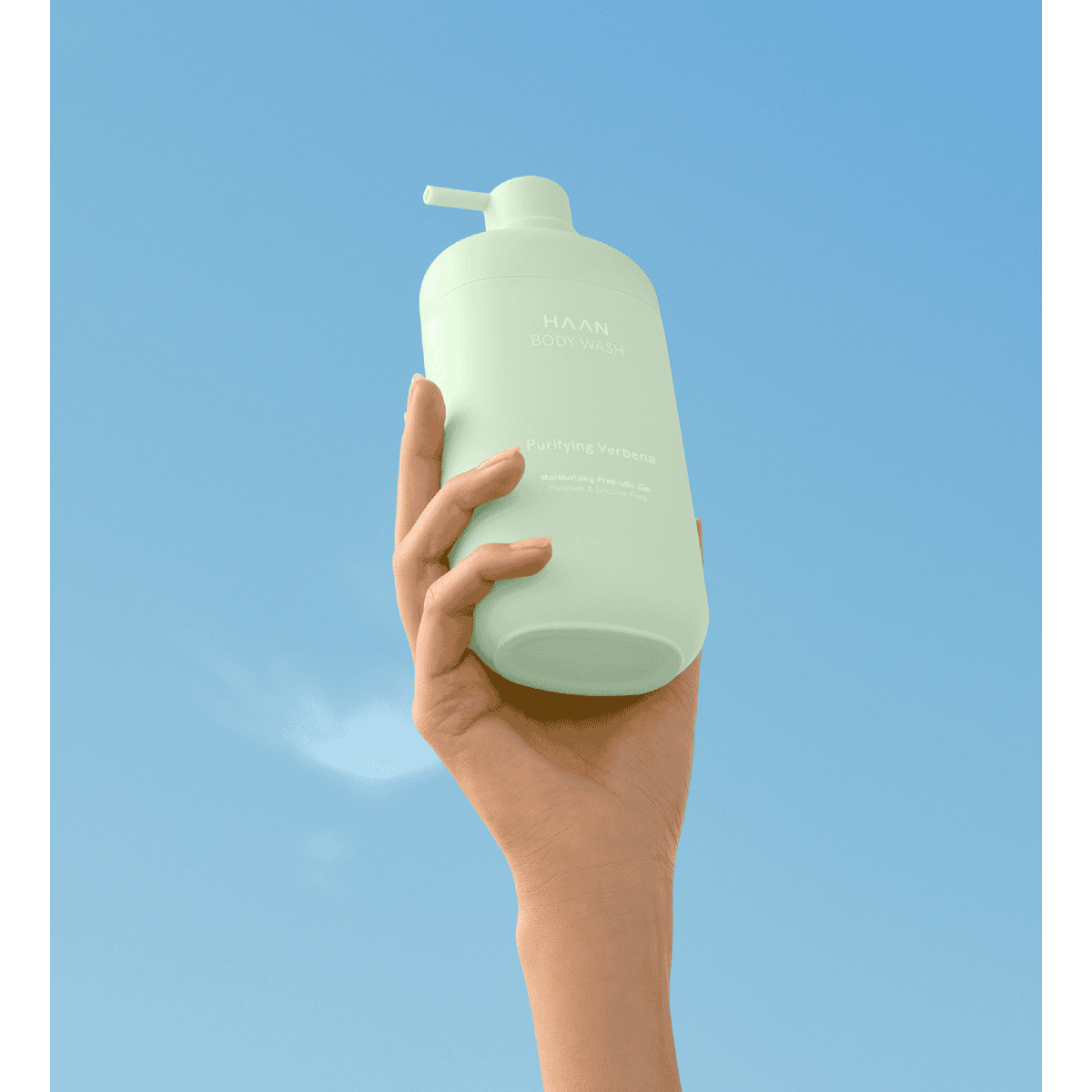 Haan Body Wash Purifying Verbena is a refreshing body wash designed to restore your skin's natural pH levels while gently cleansing. Formulated with a prebiotic complex and 87% natural ingredients, including Aloe Vera, it refreshes, replenishes, and moisturizes your body. The citrus, floral, and wood fragrance revives body and mind, making it ideal for daily use. Eco-friendly and vegan, it comes in a refillable and recyclable container.