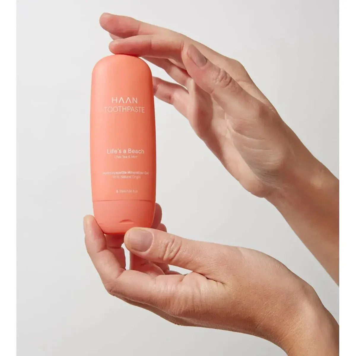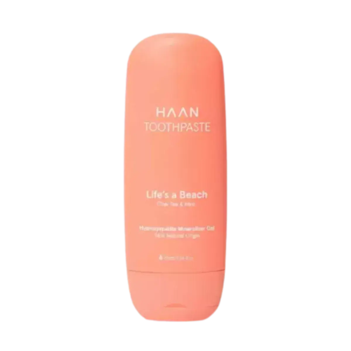 Haan Toothpaste Life's A Beach is a refreshing gel toothpaste with a spicy mix of chai tea and mint. Formulated with Hydroxyapatite, it helps remineralize enamel, whiten teeth, and reduce sensitivity. Ideal for daily use, it supports a healthy oral microbiome with prebiotics and xylitol.