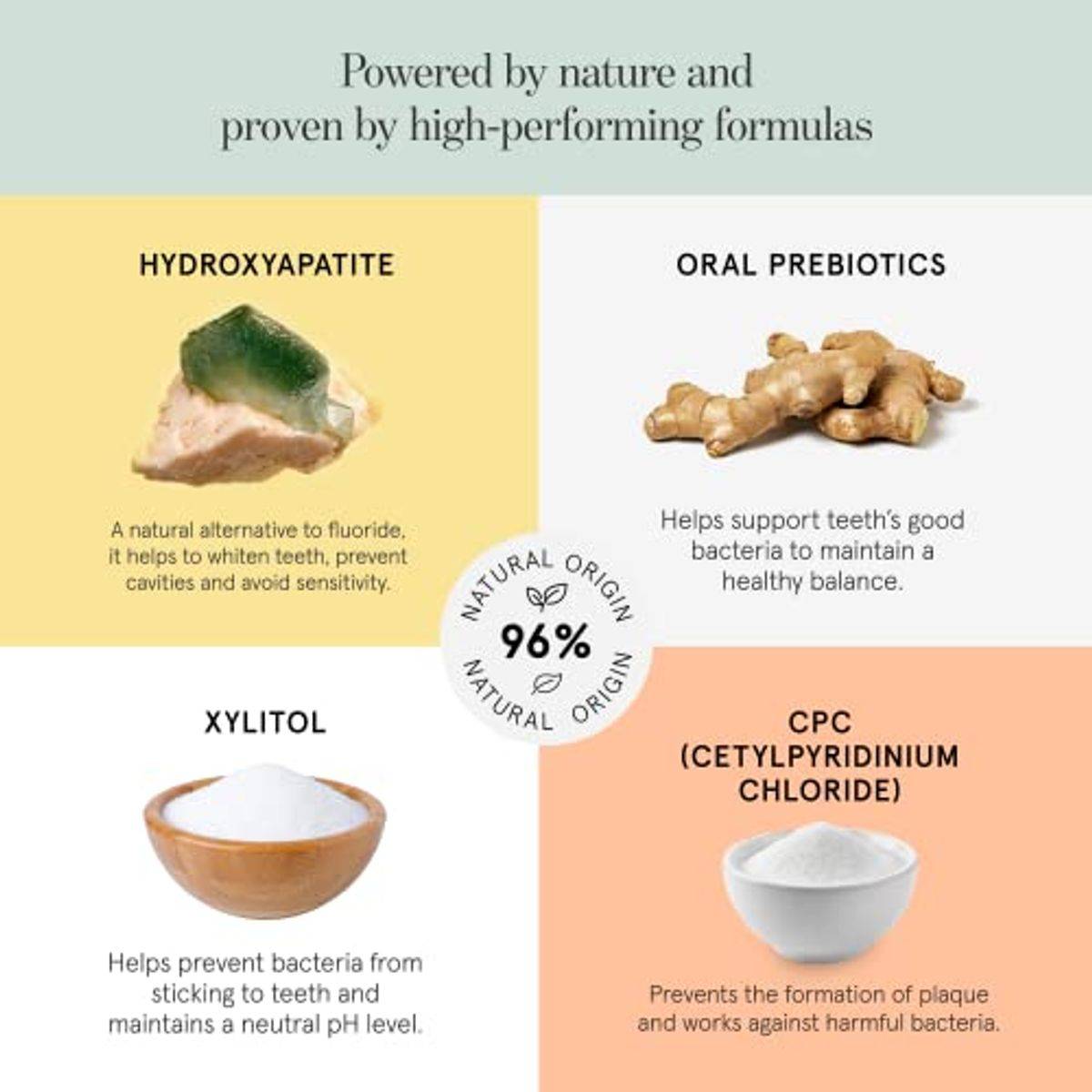 Sorbitol, Aqua, Hydrated Silica, Glycerin, Hydroxyapatite, Peg 8, Xanthan Gum, Titanium Dioxide, Xylitol, Inulin, Fructose, Cetylpyridinium Chloride, Aroma, Mentha Arvensis Herb Oil, Mentha Piperita Oil, Sodium Saccharin, Sodium Chloride, Cocamidopropyl Betaine, Sodium Benzoate, Potassium Sorbate, Limonene.