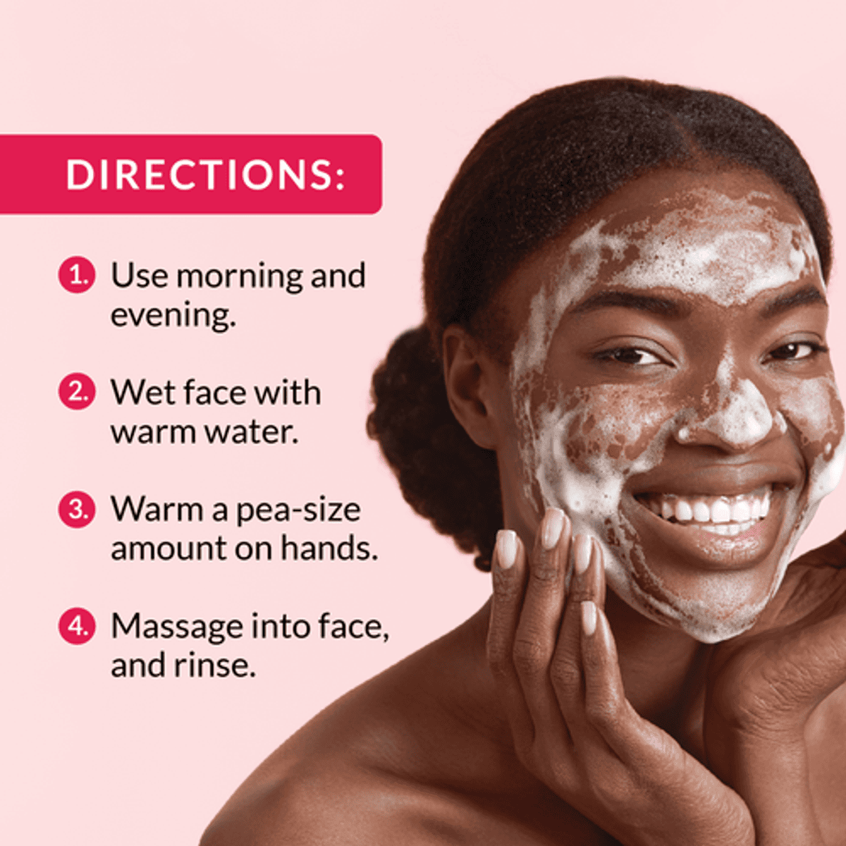 Wet your face and hands with lukewarm water. Use a pea-sized amount of cleanser, lather into a creamy foam, massage in circular motions, rinse well, and pat dry.