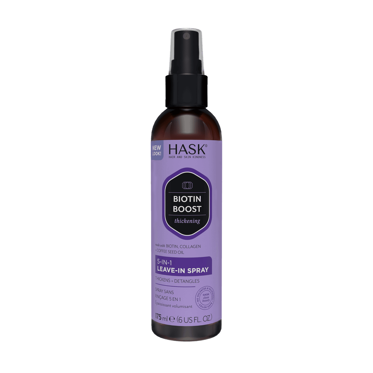 Hask Biotin Boost 5 In 1 Leave In Spray is formulated with biotin, collagen, and coffee seed oil to strengthen hair, reduce split ends, and promote thicker-looking hair. Ideal for fine, thin hair.