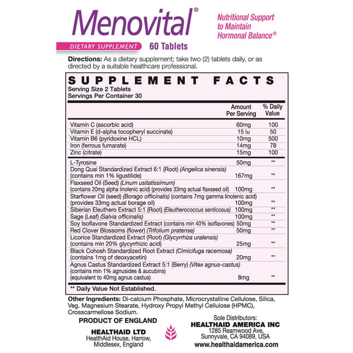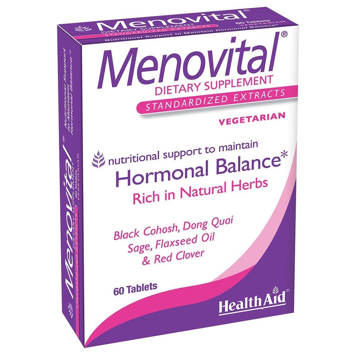 HealthAid Menovital Tablets provide nutritional support for women during menopause. Formulated with essential vitamins and minerals, it helps balance hormones and reduce menopause symptoms like hot flashes and irritability. Suitable for vegetarians, it is free from gluten, dairy, and artificial preservatives.