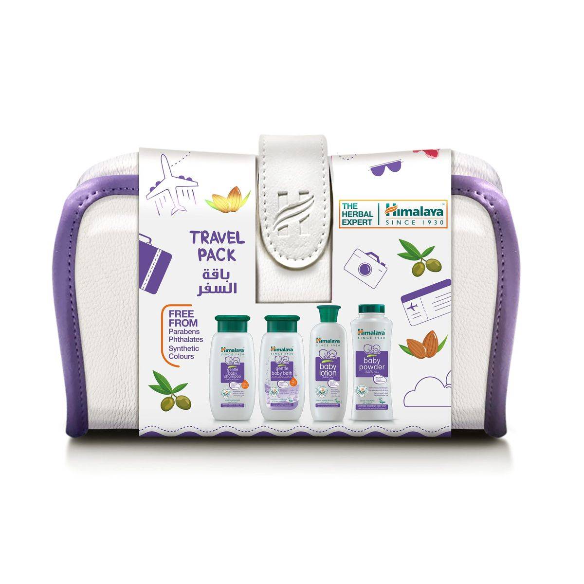 Himalaya Baby Care Travel Pack includes essential baby products: shampoo, lotion, powder, and bath. Perfect for on-the-go care, free from parabens and synthetic colors.