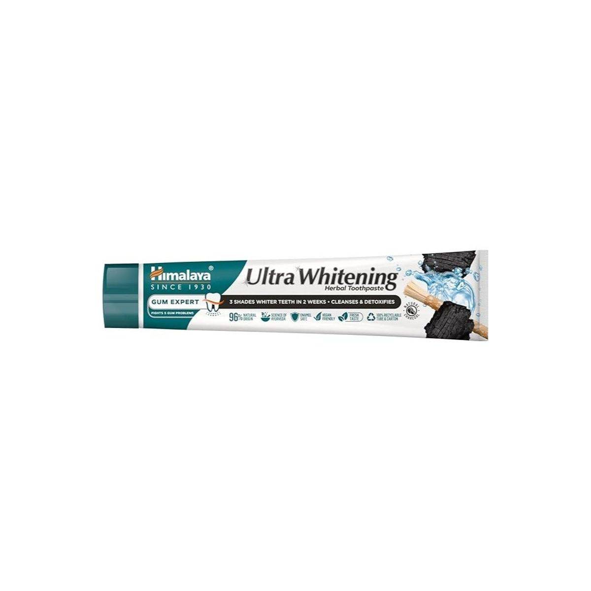 Himalaya Ultra Whitening Herbal Toothpaste is formulated with activated coconut charcoal powder for whitening. It includes herbs like Miswak, Almond Shell, and Blackseed Oil to tighten gums and remove plaque, keeping teeth strong and breath fresh for up to 12 hours.